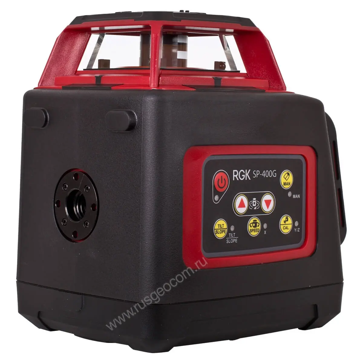 Корпус лазерного нивелира RGK SP-400G изготовлен в соответствии с классом пыле-влагозащиты IP54. Для вертикальной и горизонтальной установки на штатив предусмотрены два крепления 5/8" внизу и на боку прибора.