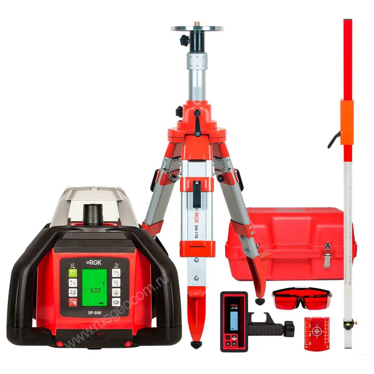 Комплект: ротационный нивелир RGK SP-500 + штатив RGK SH-170, рейка RGK LR-2