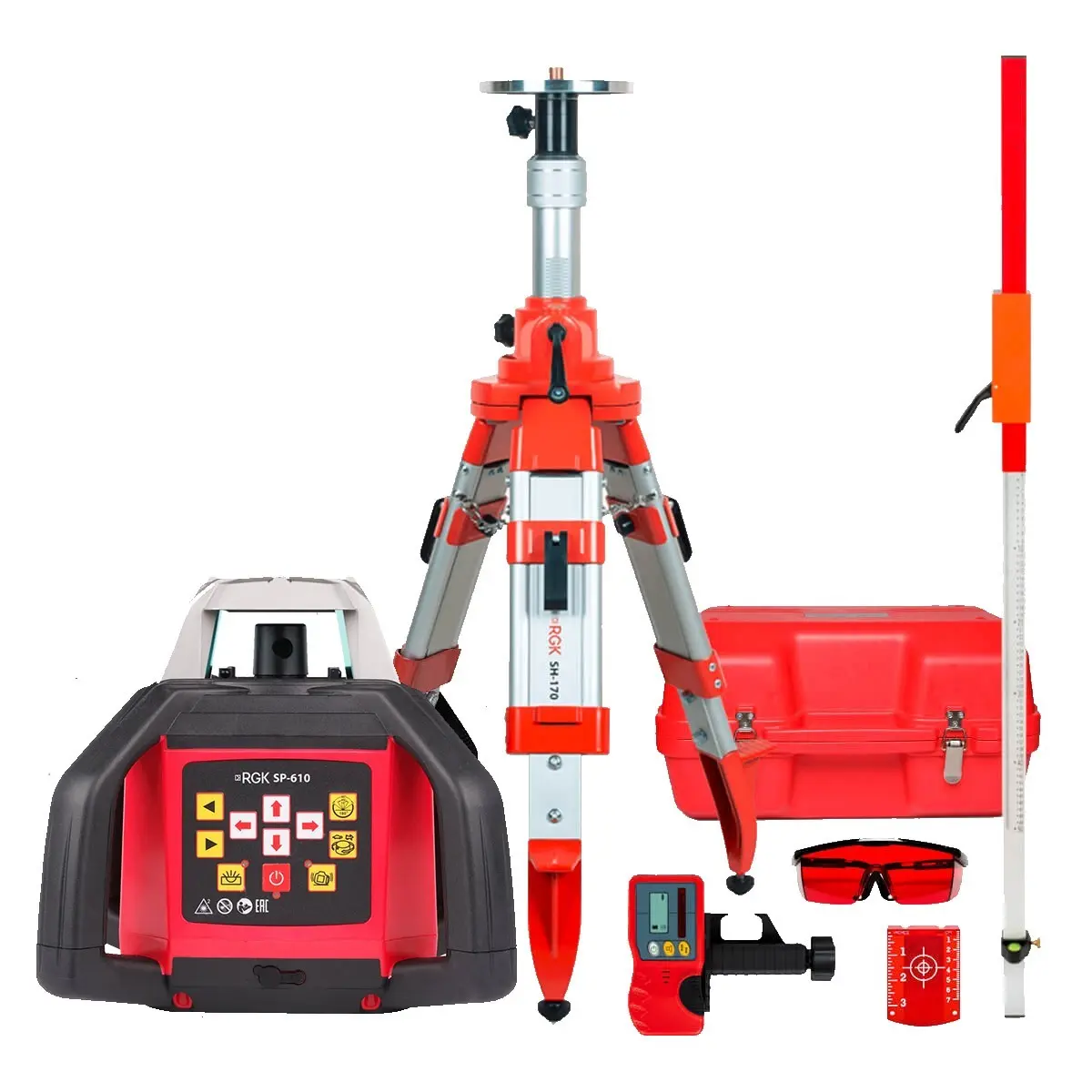 Комплект: ротационный нивелир RGK SP-610 с калибровкой + штатив RGK SH-170, рейка RGK LR-2