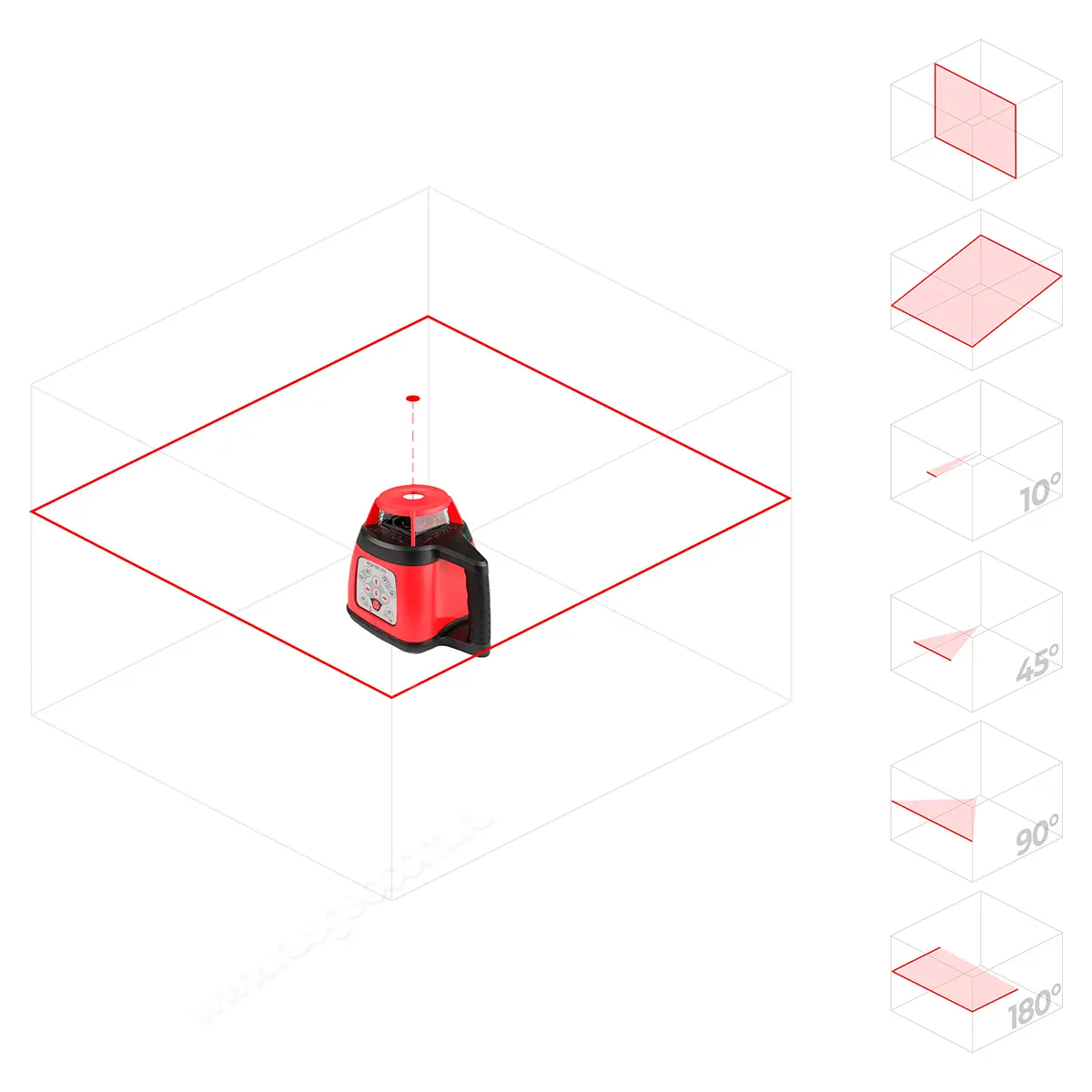 Сканирование доступен в пяти возможных вариантах ширины сектора: 0°, 10°, 45°, 90° и 180°. Это дает возможность использовать лазерный нивелир на отдельном участке строительной площадке, не создавая посторонних помех или опасности для окружающих, а кроме того помогает повысить яркость линий при работа на глаз.