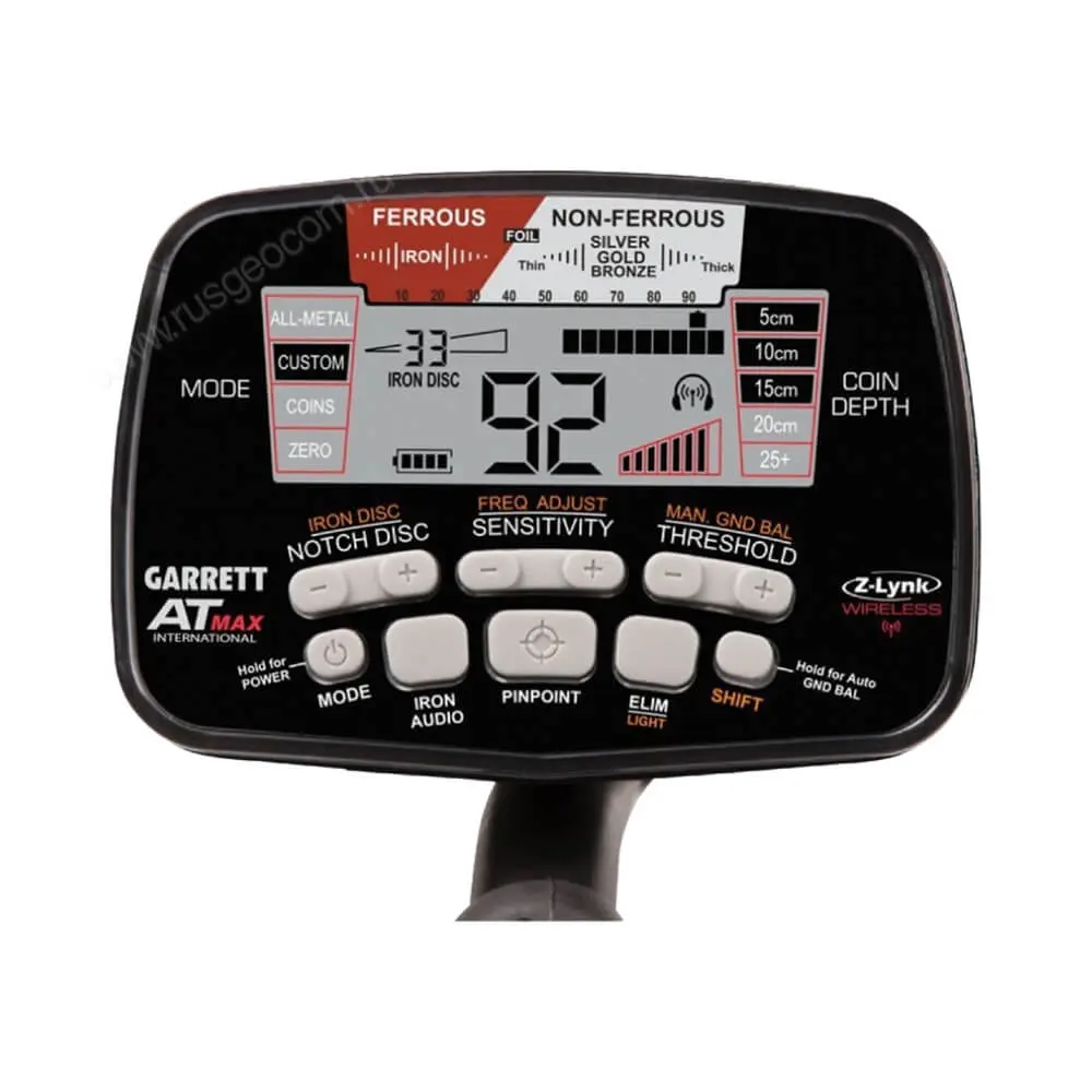 Детектор профессионального Garrett AT MAX оснащен режимом выборочной дискриминации, регулировкой громкости отклика, чувствительности, изменяемым пороговым тоном, возможностью ручной отстройки от грунта и другими стандартными для приборов данной категории функциями.
