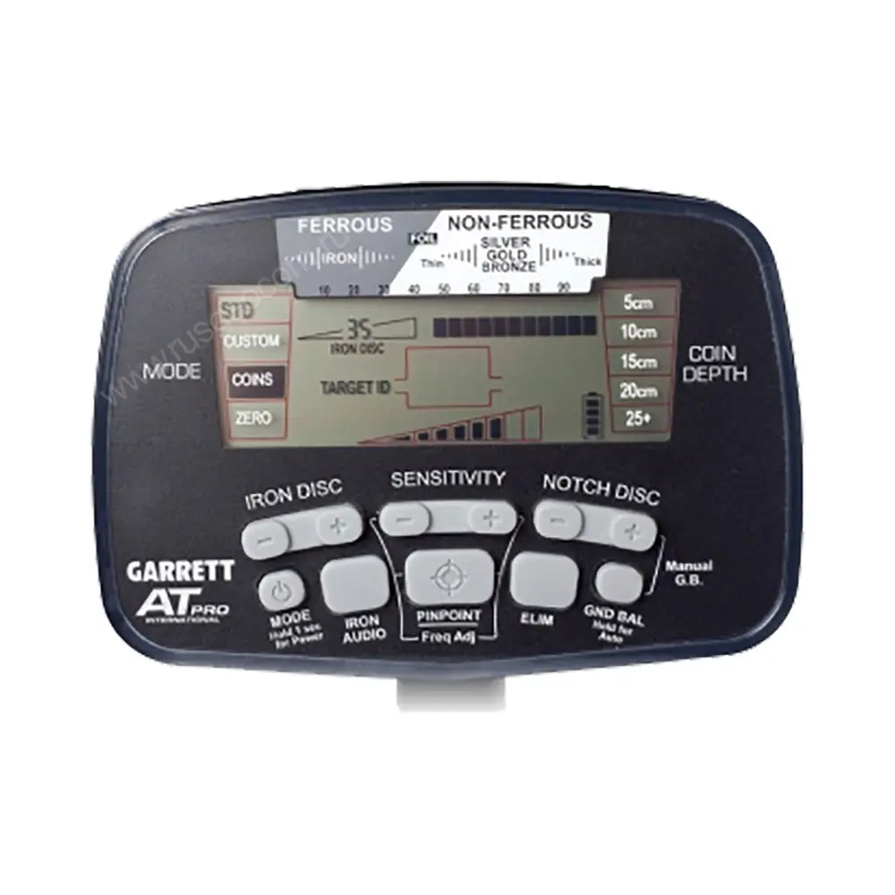 Обработка полученных от поисковой катушки данных производится в микропроцессорном электронном блоке, который оснащен ЖК дисплеем и кнопочной панелью управления. Металлоискатель GARRETT AT PRO работает в трех стандартных и трех профессиональных режимах, которые отличаются видом звуковой индикации поиска. Маска дискриминации имеет три позиции: