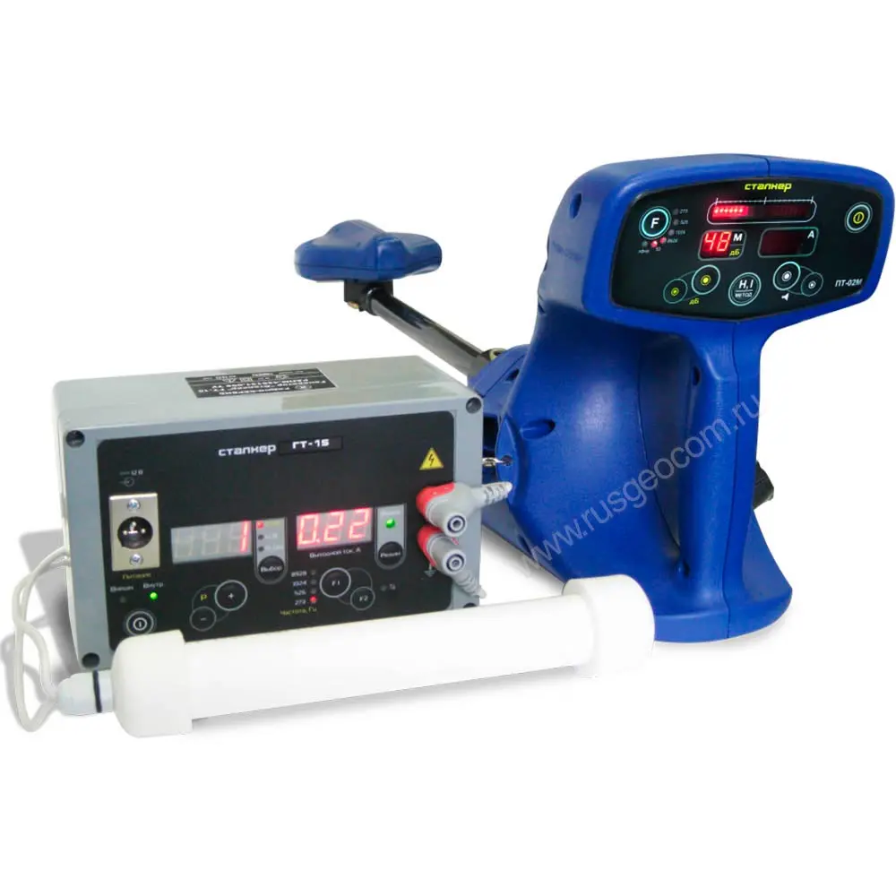 Трассоискатель Сталкер 15-04 - поисковый комплект, включающий в себя приемник ПТ-04 и генератор сигналов ГТ-15 с набором принадлежностей и аксессуаров, который может использоваться для обнаружения, контроля планового положения и определения глубины залегания скрытых в земле токопроводящих коммуникаций – кабелей и металлических трубопроводов. При задействовании опционального GPS-приемника выполняется координатная привязка выявленных коммуникаций, с сохранением треков во внутренней памяти приемника.