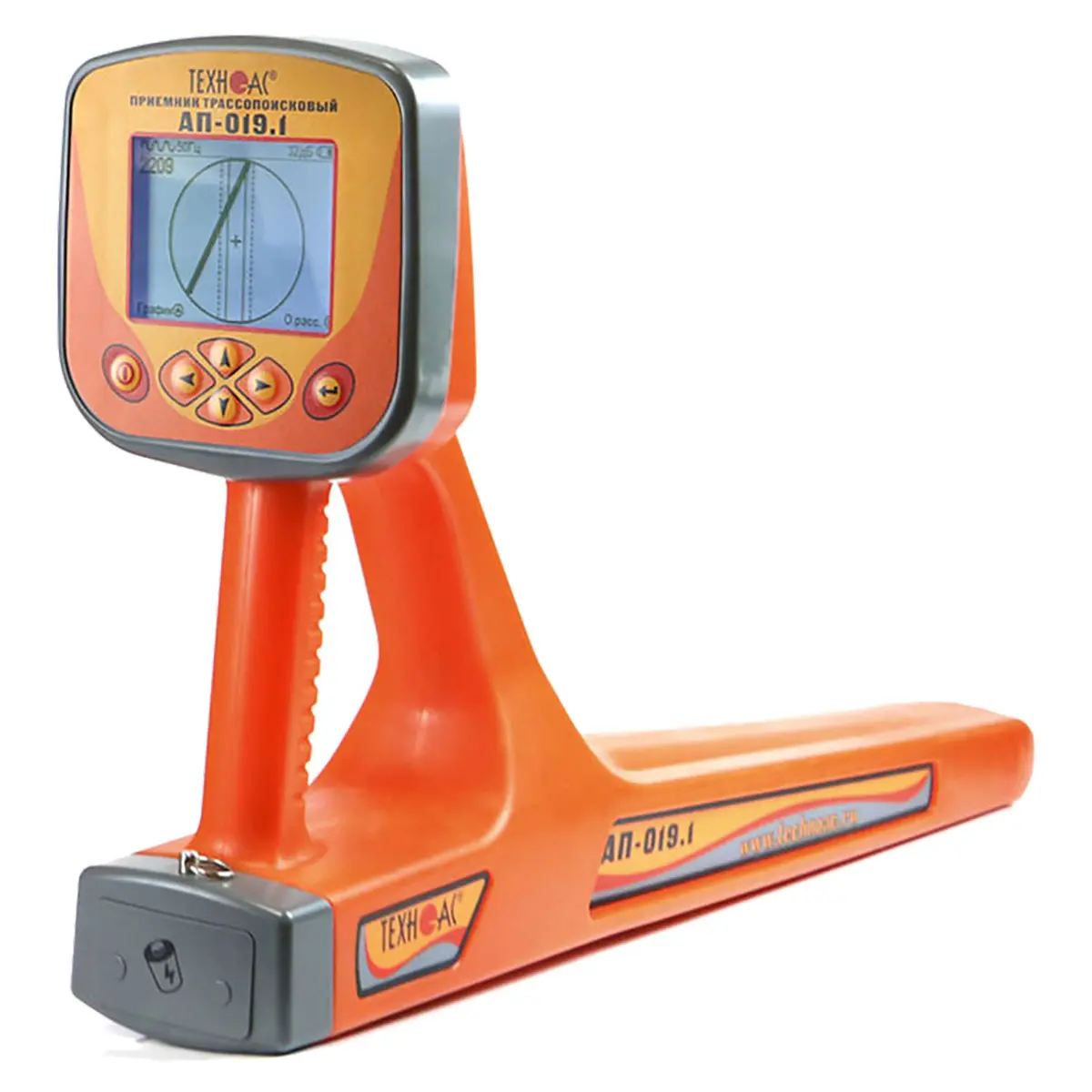 Трассопоисковый приемник в виде моноблока с крупным ЖК дисплеем отображает изображение трассы непосредственно на экране. Один из ключевых плюсов трассоискателя - автоматический расчет и вывод на экран глубины залегания коммуникации до 10 м, а также величины тока в линии, что значительно упрощает процесс поиска.