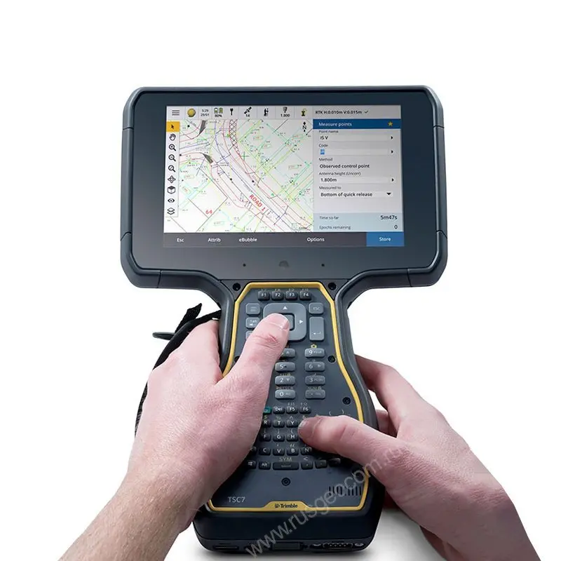 Полевой контроллер Trimble TSC7 оснащен большим 7-дюймовым дисплеем с альбомной ориентацией для удобного управления процессом съемки местности и ведения абриса. Ввод информации осуществляется с помощью сенсорного экрана и с помощью активного пера, благодаря чему, устройством удобно пользоваться в перчатках. Полевой контроллер обеспечивает удаленное управление электронными тахеометрами и GNSS-приемниками , а также, предварительную обработку полученных данных.