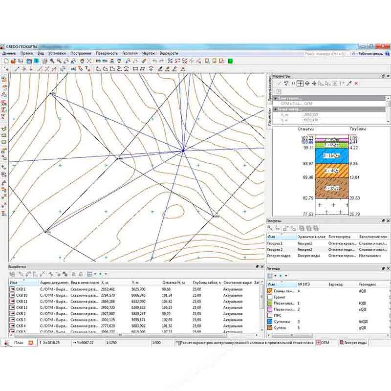 Система КРЕДО ГЕОКАРТЫ предоставляет пользователю широкие возможности для формирования собственной базы геологических данных, предназначенной для анализа геологического строения местности и получения необходимых выходных графических элементов.