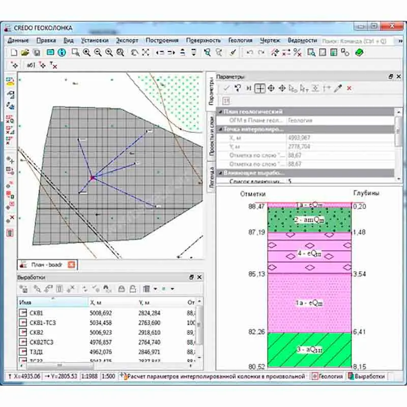 Система КРЕДО ГЕОКОЛОНКА предоставляет пользователю широкие возможности для формирования собственной базы геологических данных, предназначенной для анализа геологического строения в произвольной точке местности и получения необходимых выходных графических элементов.