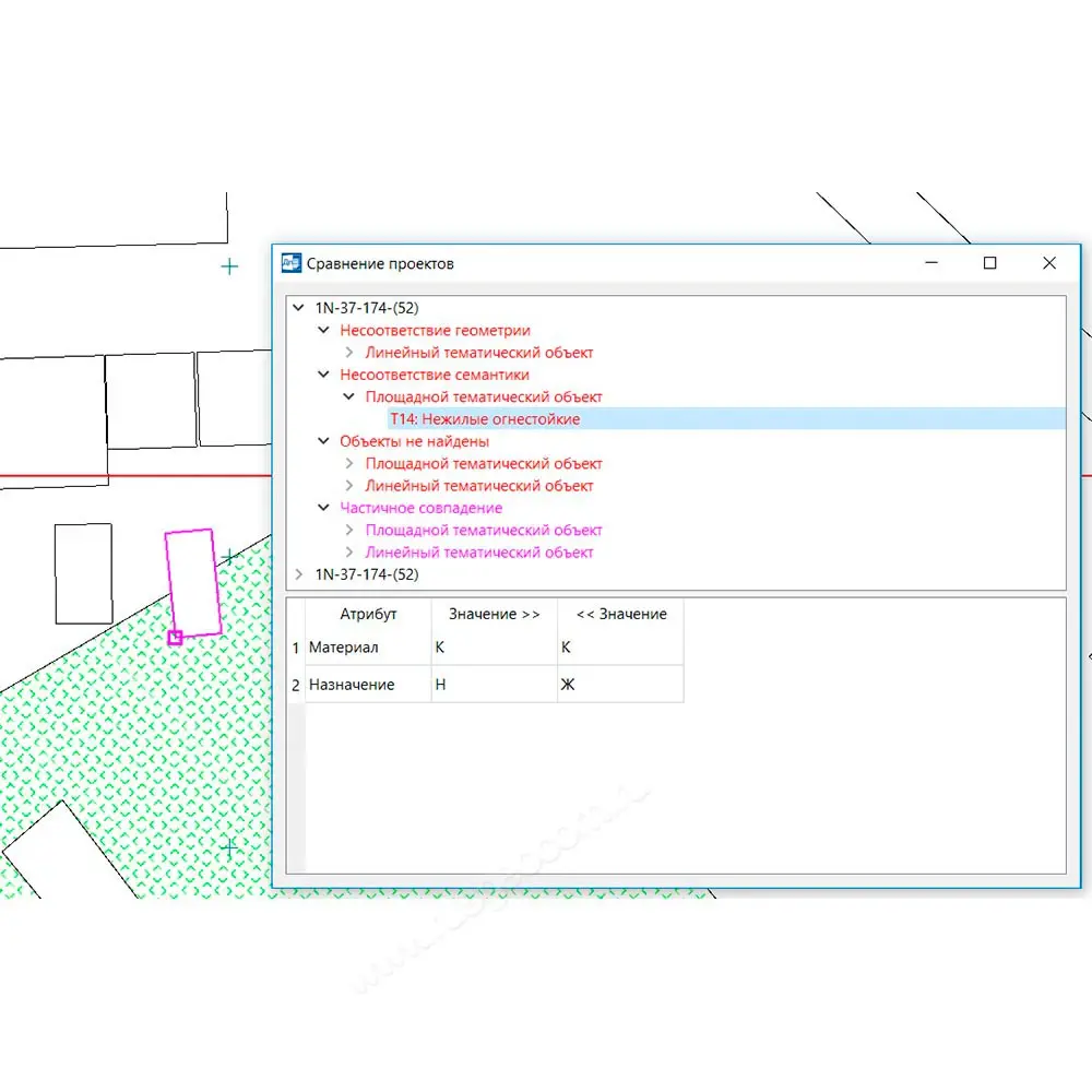 - Оценка корректности изменений. Процесс приемки и проверки измененных данных является наиболее ответственным этапом мониторинга, ведь от его результатов зависит достоверность всей информационной модели. Несмотря на то, что без полевого контроля съемки сделать однозначные выводы достаточно проблематично, в большинстве случаев актуальность и корректность изменений можно оценить, сравнивая наличие и положение элементов местности до и после редактирования. Для упрощения этой задачи предназначена специальная команда, позволяющая оценить пространственное положение "старых" и "новых" объектов, а также их семантические описания. На начальном этапе необходимо указать допустимое расхождение в координатах, после чего система сравнит объекты и выведет интерактивный протокол обнаруженных аномалий. При выделении строк в верхней части диалога изображение в графическом окне фокусируется в области объекта, а сам объект выделяется цветом. В нижней части протокола возможно копирование значений семантики между объектами – для этого достаточно выбрать заголовок столбца с соответствующими стрелками.