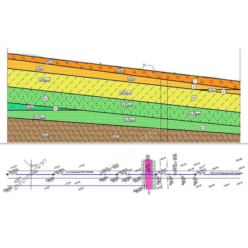 В системе можно проанализировать созданную модель рельефа, построив разрез произвольного сечения. На разрез передаются данные, набор которых определяет сам пользователь: условные обозначения пересекаемых коммуникаций, данные развернутого плана, геологические данные и др.