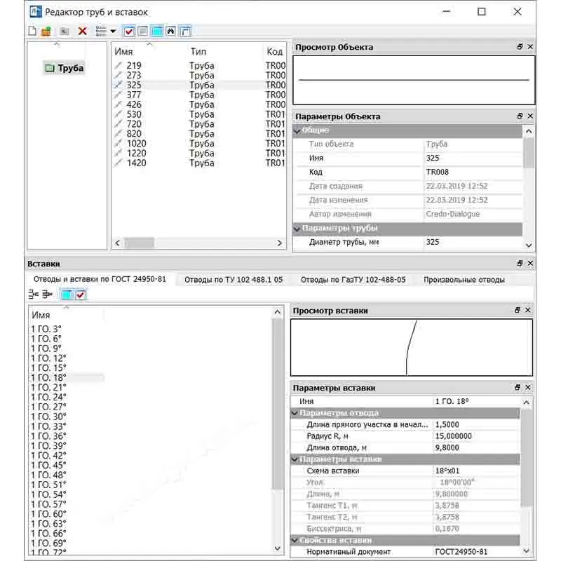 В КРЕДО ТРУБОПРОВОД.ИЗЫСКАНИЯ встроен Редактор труб и вставок, который предназначен для создания библиотеки объектов типа "труба" и вставок с нужными параметрами в соответствии с заданными нормативными документами. В стандартный комплект поставки входит библиотека труб со вставками по различным нормативным документам. Для труб и вставок заданы условные обозначения, подписи, семантика. При создании трассы трубопровода пользователь выбирает тот или иной тип трубы и программа автоматически подбирает необходимые схемы вставки из библиотеки.