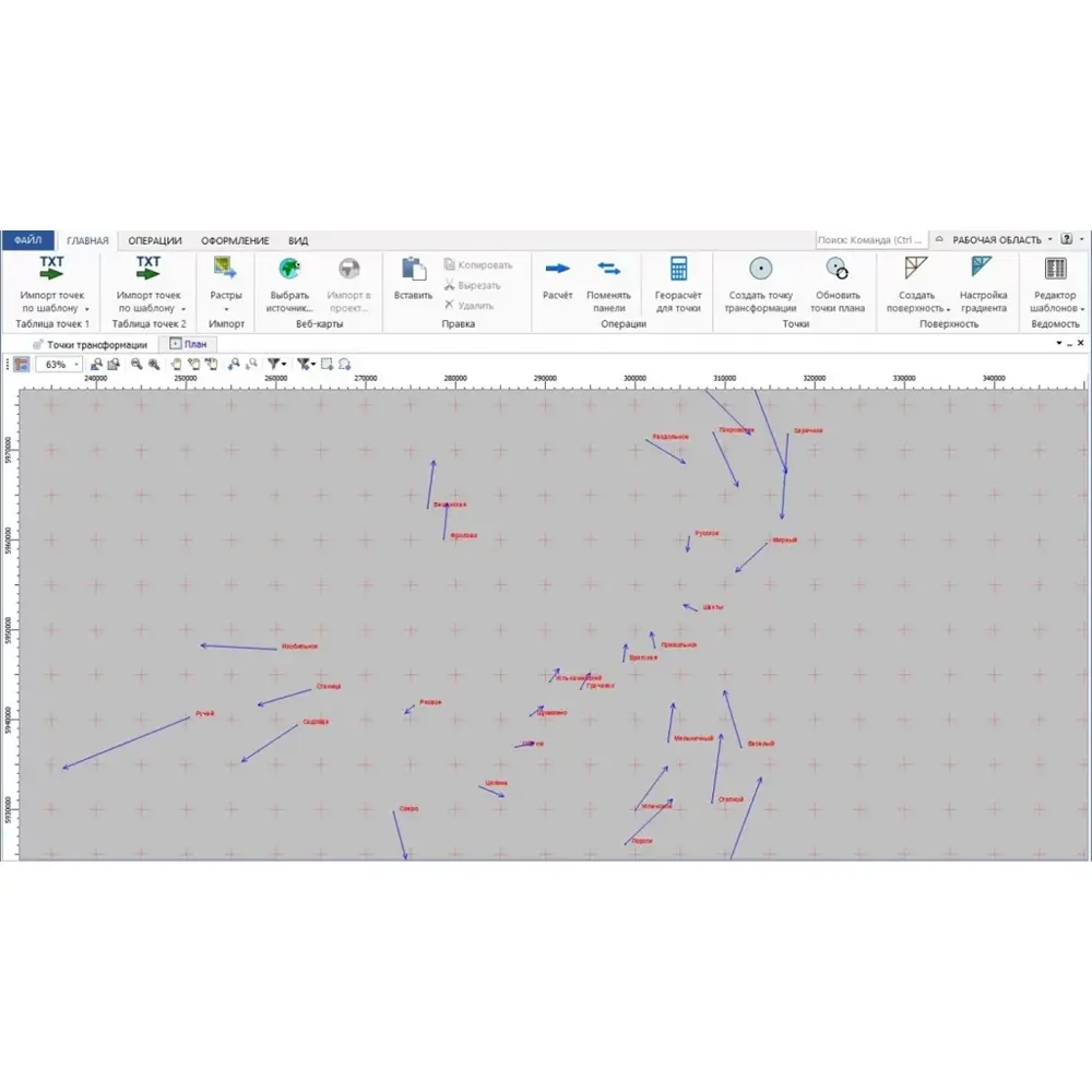 Для визуального сравнения взаимного положения совмещенных пунктов в ТИМ КРЕДО ТРАНСКОР можно открыть графическое окно. При установлении параметров связи (все виды установления параметров плоских СК) невязки между различными системами координат в окне графики отображаются при помощи векторов.
