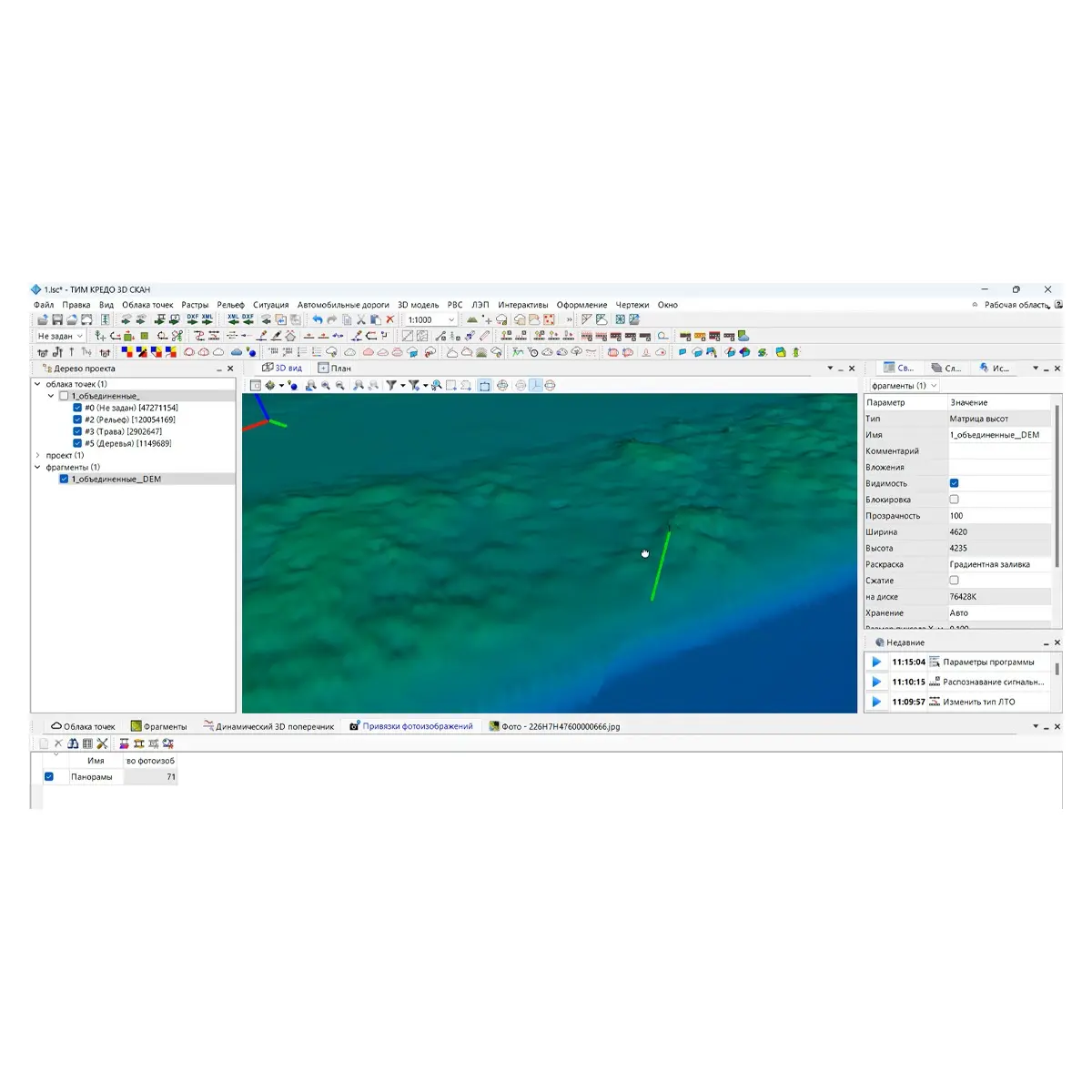- Расчет уклонов: Вычисление продольных и поперечных уклонов дорожного покрытия с заданным шагом измерений по облаку точек.