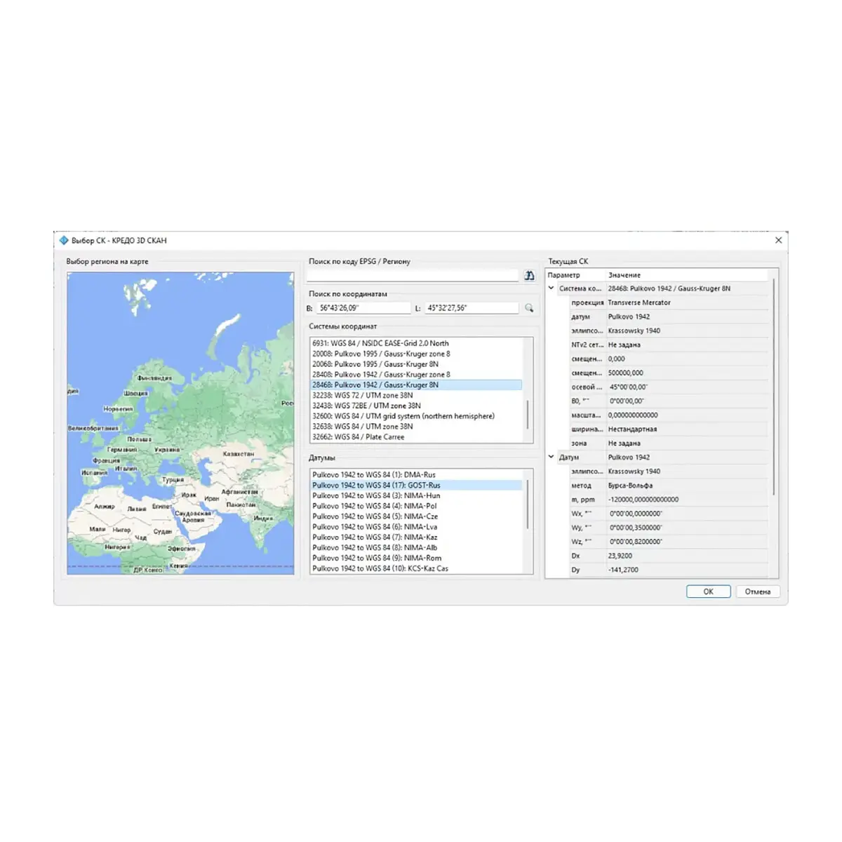В ТИМ КРЕДО 3D СКАН доступна настройка параметров классификатора топографических объектов, выбор системы координат, выбор варианта отображения объектов на плоскости и единиц измерения. Есть возможность импортировать системы координат из базы данных EPSG, для удобства поиска объектов в базе реализован графический интерфейс.