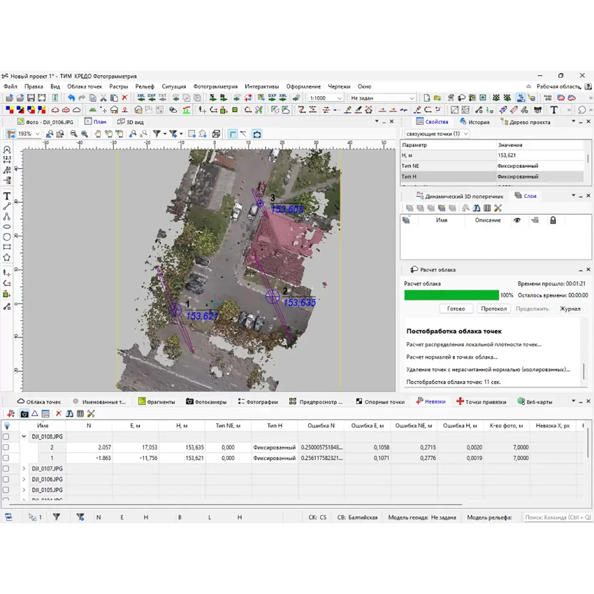 В ТИМ КРЕДО ФОТОГРАММЕТРИЯ реализована возможность поэтапного расчета: первый этап завершается уравниванием и позволяет визуально оценить качество полученной модели посредством "редкого облака точек". Это позволяет своевременно устранить ошибки или уточнить параметры, не тратя время на продолжительные по времени этапы формирования плотного облака. В результате уравнивания вычисляются невязки опорных точек. Значения невязок отображаются в таблице Опорные точки, графически на плане и в 3D. Дополнительно в соответствующей таблице отображаются пиксельные невязки связующих точек. Таблица позволяет локализовать точки и фотографии с наибольшими значениями невязок и быстро перейти к соответствующей связующей точке на фотоснимке.