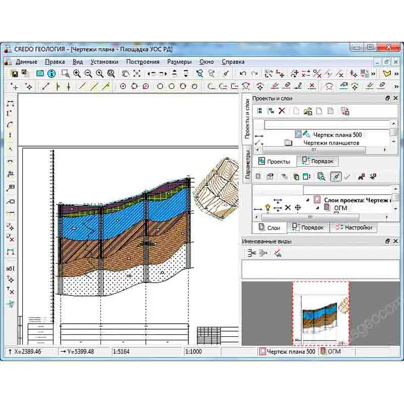 ТИМ КРЕДО ГЕОЛОГИЯ позволяет выпускать чертежи схем расположения выработок и разрезов. Чертеж можно распечатать или сохранить в файле формата DXF.