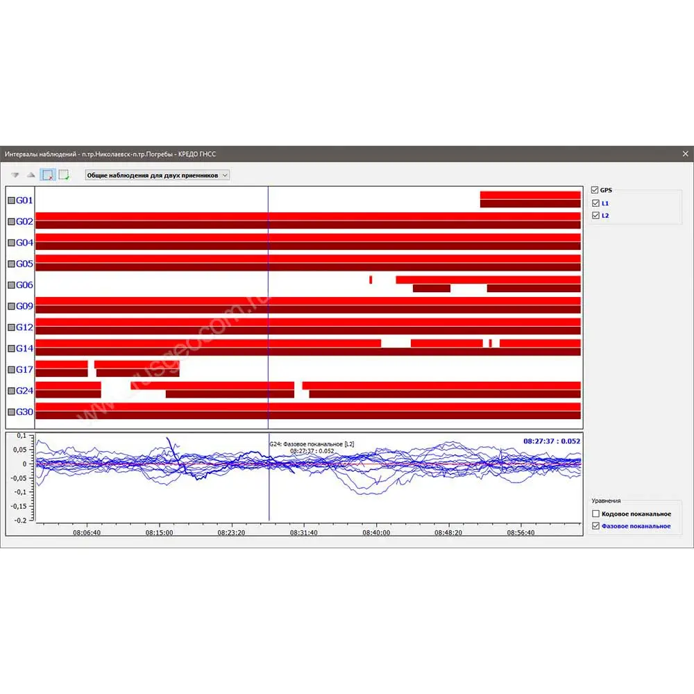 ТИМ КРЕДО ГНСС предоставляет удобные инструменты для просмотра, анализа и редактирования данных спутниковых измерений. Данные по сессиям наблюдений и эфемеридам проекта можно просматривать в виде временных диаграмм. Наблюдения сессии, используемые модели физических явлений, оценку качества наблюдений в виде разности вычисленного расстояния до спутника и соответствующего наблюдения, DOP можно просматривать в удобном виде диаграмм видимости спутников и графиков рассматриваемой величины от времени.