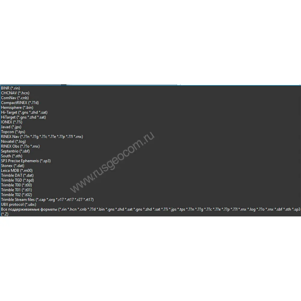 - Trimble — *.dat, *.tgd, *.t00, *.t01, *.t02, потоковые форматы *.cap, *.org, *.r17, *rt17, *.r27, *.rt27,