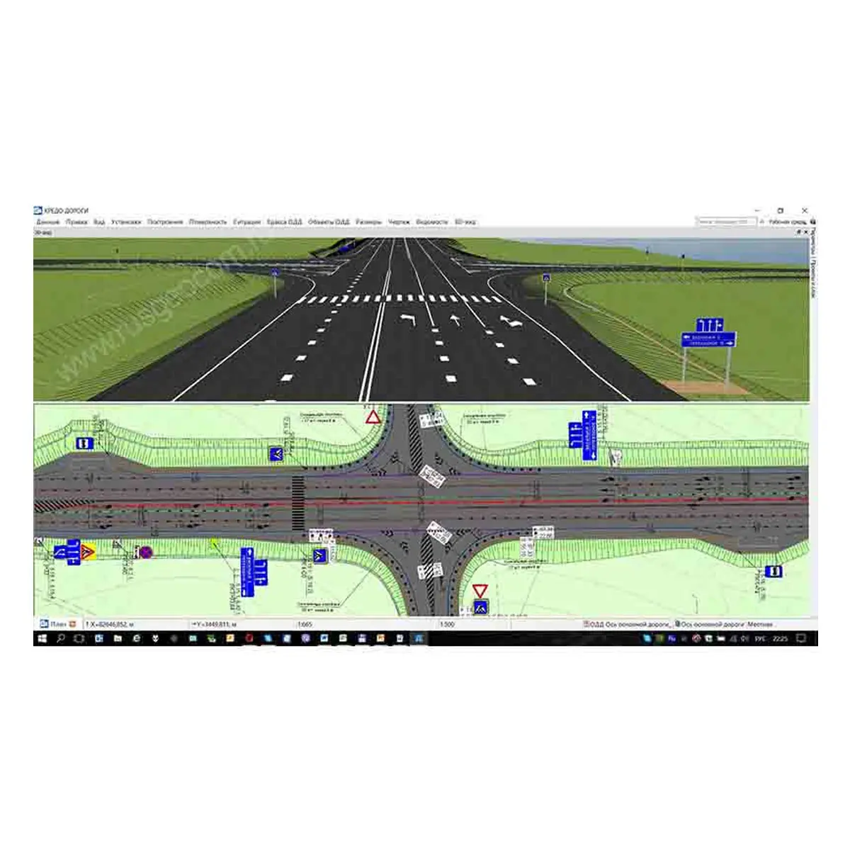 Горизонтальна разметка (точечная, линейная и площадная) так же, как и остальные элементы ТСОДД проектируется по активной трассе как в ручном, так и в автоматизированном режиме.