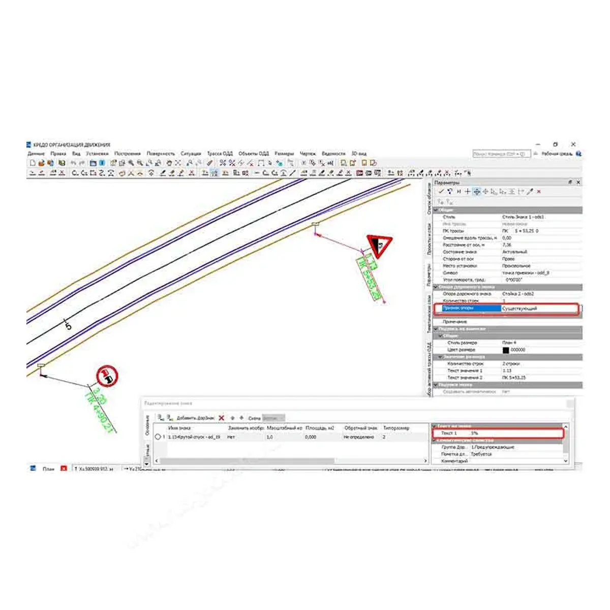 Дорожные знаки легко редактируются как в окне параметров, так и в графической области.