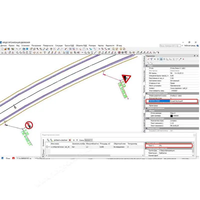 Дорожные знаки легко редактируются как в окне параметров, так и в графической области.