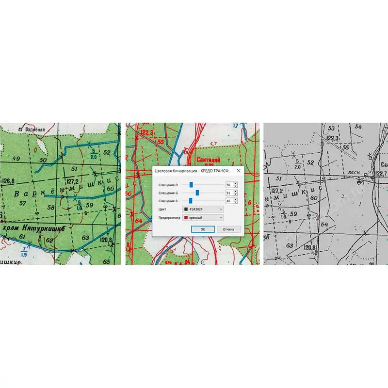 - выполнение цветоделения – извлечение пикселей заданного цвета с порогом в черно-белое растровое изображение;