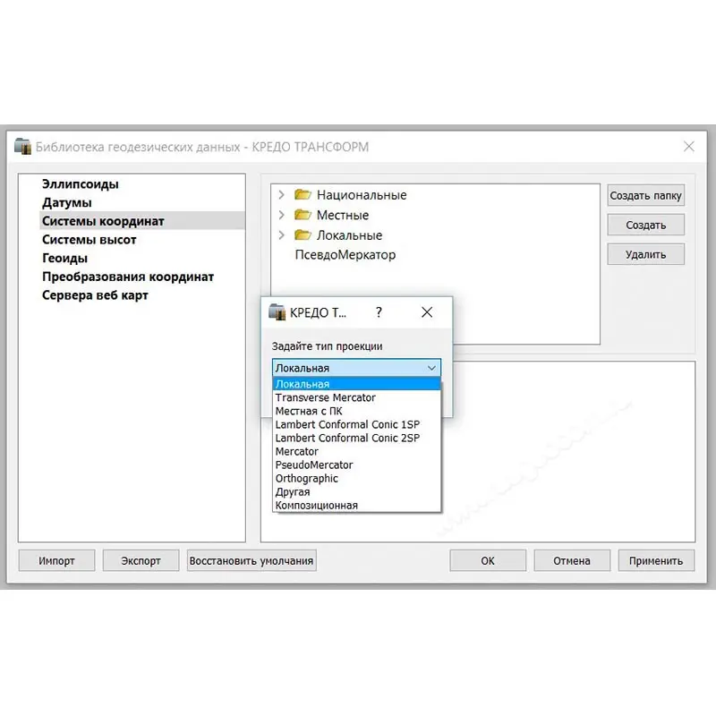 - поддержка локальной системы координат или систем координат в проекциях — Поперечно-цилиндрическая Меркатора, ПсевдоМеркатора, Коническая Ламберта, Ортографическая, Композиционная и ряда других;