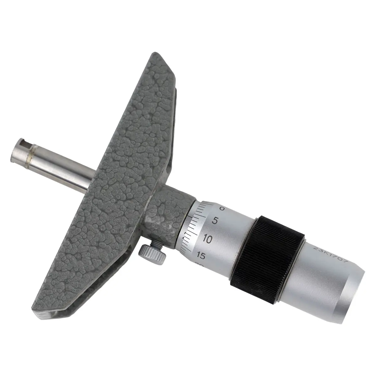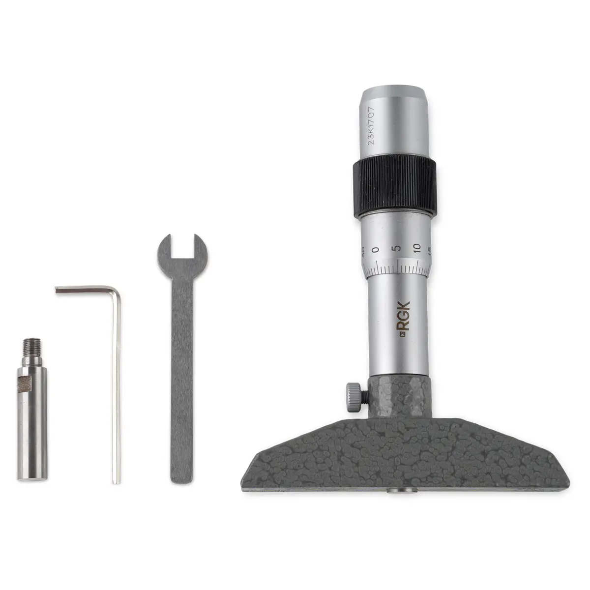Шкала микрометрического глубиномера с отчетливыми гравированными отметками на стебле и барабане позволяет считывать показания с погрешностью не более ±4 мкм. Плоские твердосплавные поверхности измерительных стержней, обработанные методом высокоточного шлифования, характеризуются улучшенной износостойкостью. Стопорный винт в основании дает возможность фиксировать вылет микрометрического винта при считывании показаний или при перенастройке измерителя, либо при снятии и установке сменных элементов. В комплект поставки включены ключи для замены стержней и выставки начального положения шкалы барабана, а также жесткий футляр для хранения и переноски инструмента.