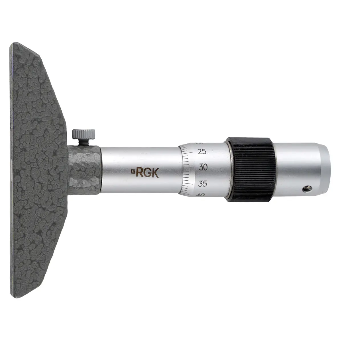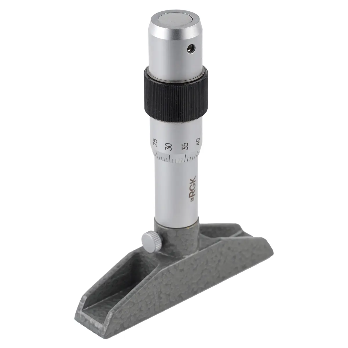 Глубиномер микрометрический RGK GM-50 предназначен для высокоточного контроля геометрических параметров различных изделий, обеспечивая определение высоты выступов и глубины отверстий, углублений и выемок относительно опорной поверхности. Изготовленный в таком же конструкционном исполнении, как младшая модель серии, прибор снабжен дополнительным измерительным стержнем калиброванной длины с винтовым креплением, что позволяет выполнять замеры в диапазоне не только 0 - 25 мм, но и 25 - 50 мм.