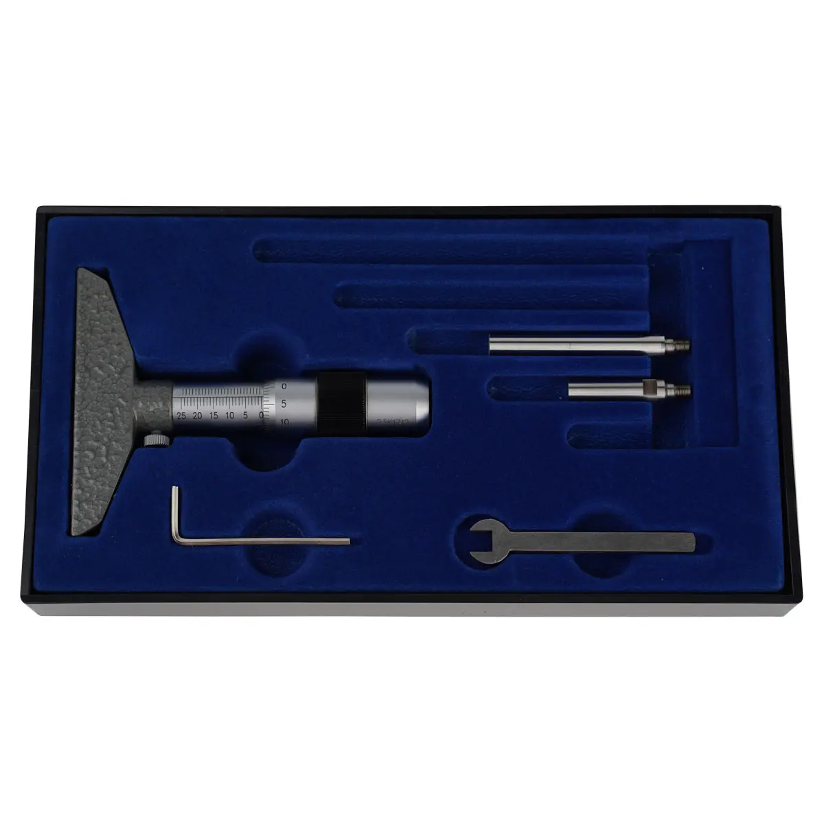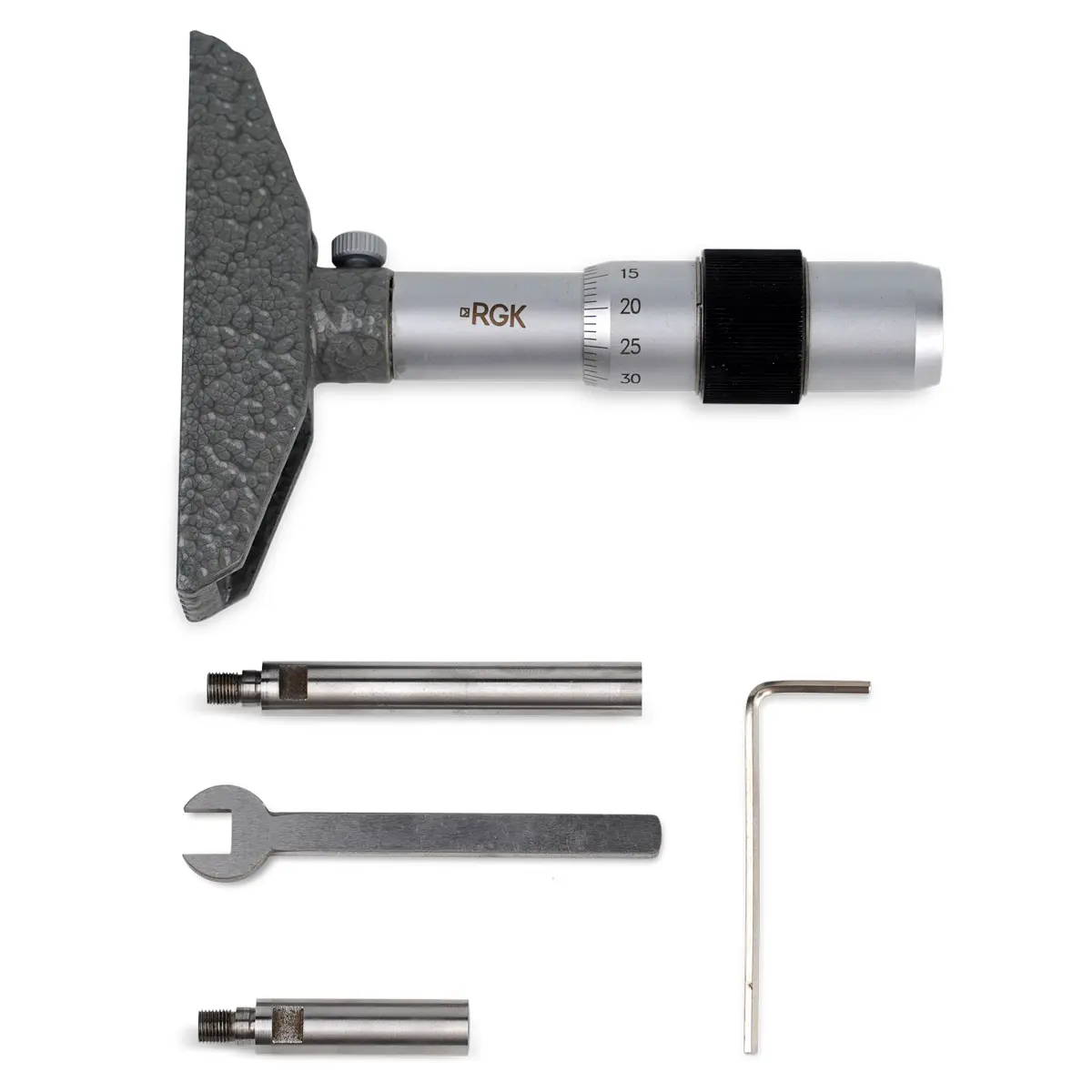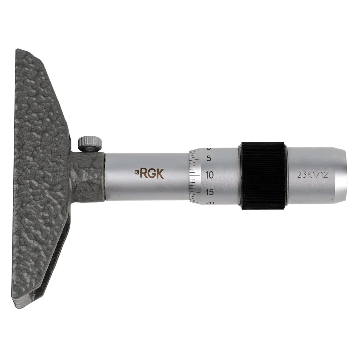 Глубиномер микрометрический RGK GM-75 обеспечивает точность измерений ±5 мкм и может использоваться для проверки геометрических параметров различных изделий в ходе изготовления, приемки и при выполнении ремонтных работ. Инструмент оснащен микрометрической головкой с максимальным вылетом 25 мм и способен производить замеры в поддиапазонах 0 - 25, 25 - 50 и 50 - 75 мм при установке измерительных стержней соответствующей длины, которые включены в комплект поставки вместе с рожковым ключом для их быстрой замены.