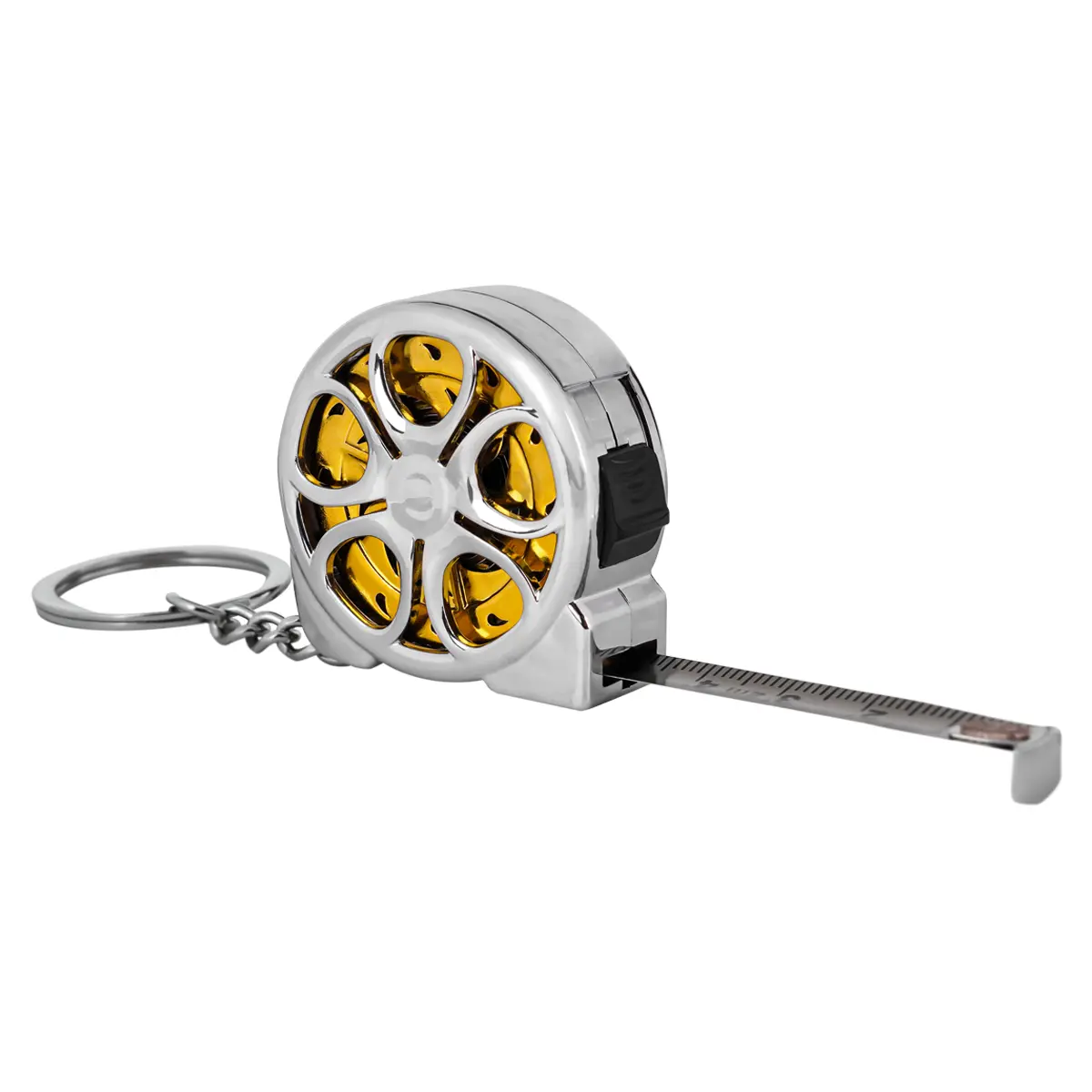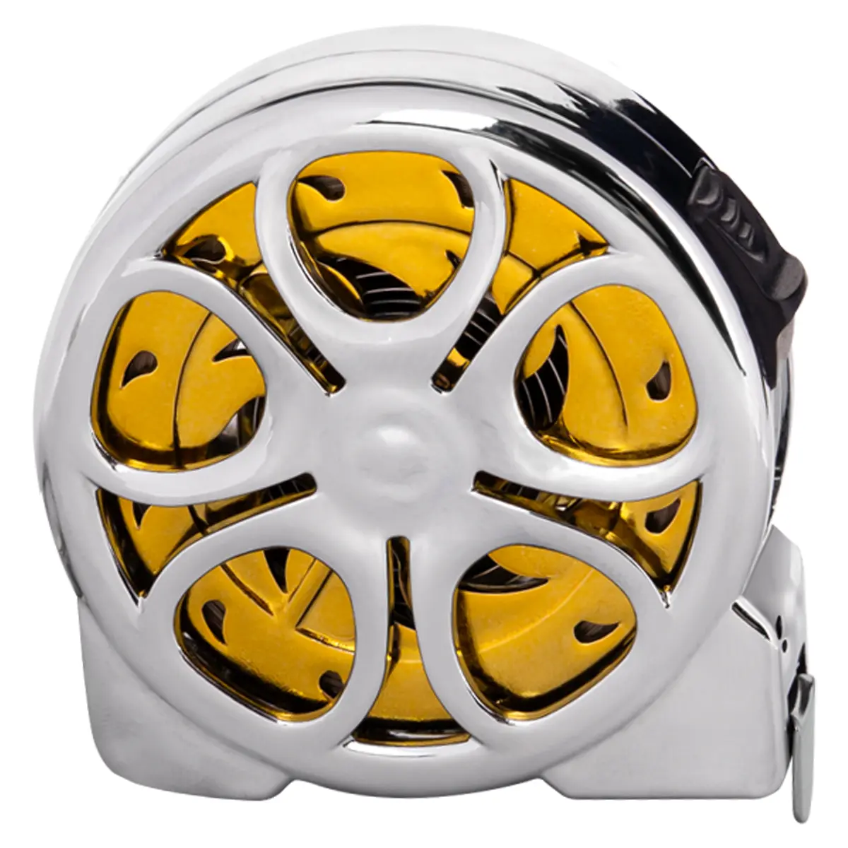 Корпус измерительной рулетки выполнен в современном стиле: легкий, но прочный, с рельефной формой, обеспечивающей надежный хват. Внешний вид — металлический блеск с золотистым акцентом внутри барабана — делает рулетку стильным аксессуаром. Кольцо-брелок позволяет носить ее на связке ключей, в кармане или на сумке — всегда под рукой.