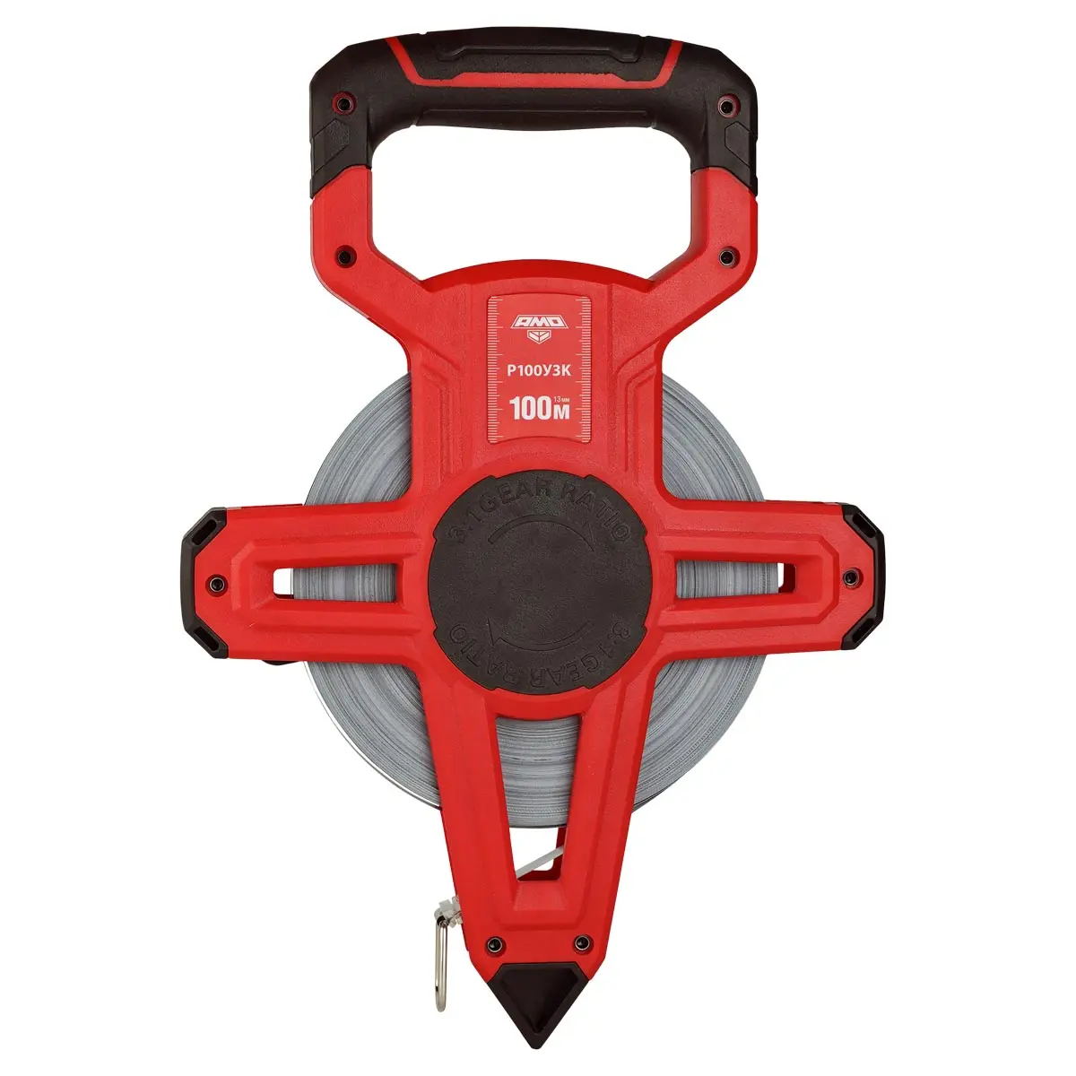 Полотно измерительной рулетки с закрепленным на конце кольцом изготовлено из углеродистой стали, за счет чего мало подвержено растяжению и деформациям, обладая более продолжительным эксплуатационным ресурсом, по сравнению с фиберглассовой лентой. Метод прямых измерений, с непосредственным считыванием показаний с миллиметровой шкалы, позволяет точно фиксировать начальную и конечную точку при выполнении замеров, не допуская ошибки наведения на предельных дистанциях, как у лазерных дальномеров. Открытый пластиковый корпус снабжен верхней ручкой и заостренным концом в нижней части для установки инструмента в выбранной точке. Механизм сматывания ленты редукционного типа позволяет путем вращения ручки быстро приводить рулетку в исходное состояние после замера.