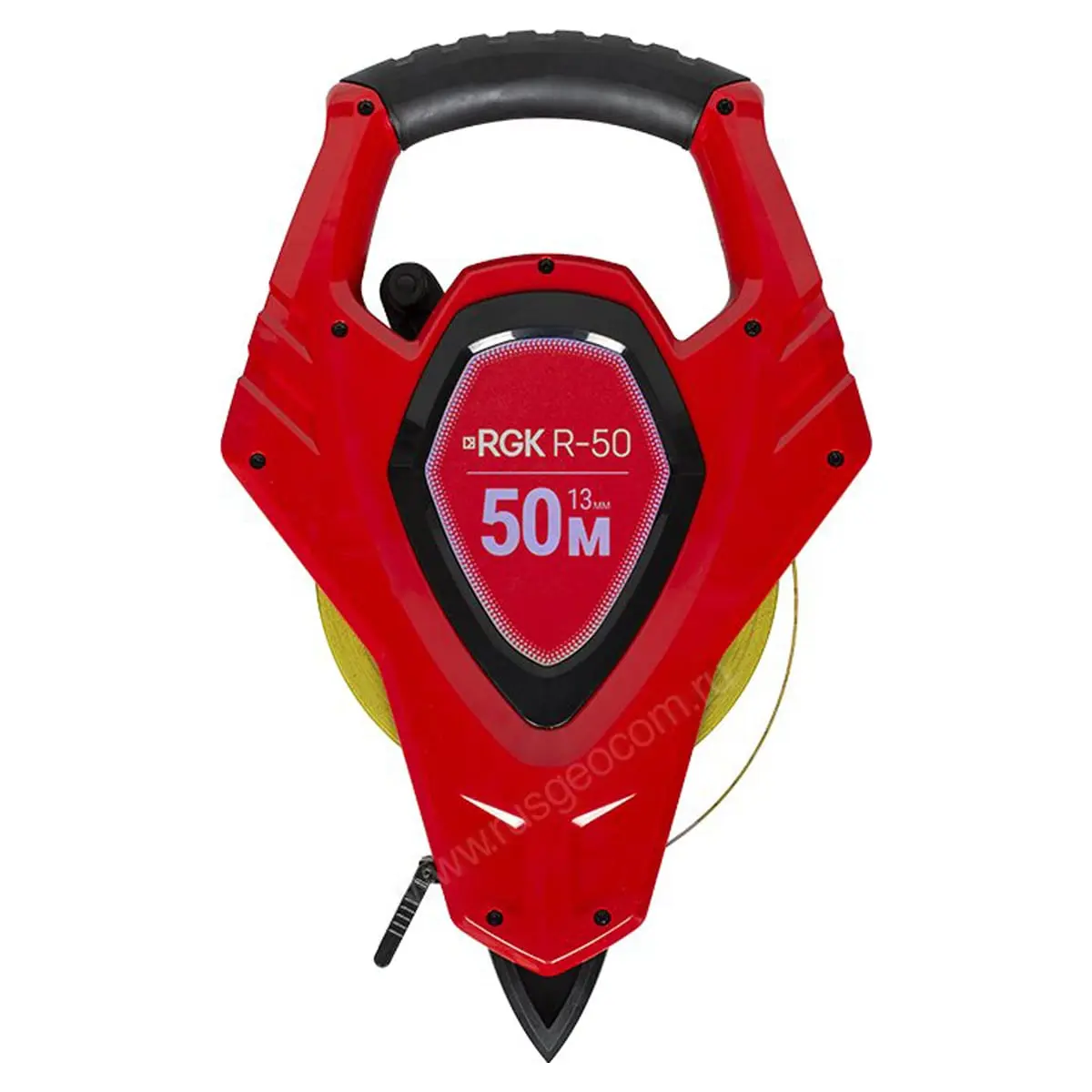 Измерительная рулетка RGK R-50 длиной 50 метров выполнена в открытом корпусе и снабжена механизмом ускоренного сматывания ленты. Нейлоновое покрытие ленты защищает ее от истирания.