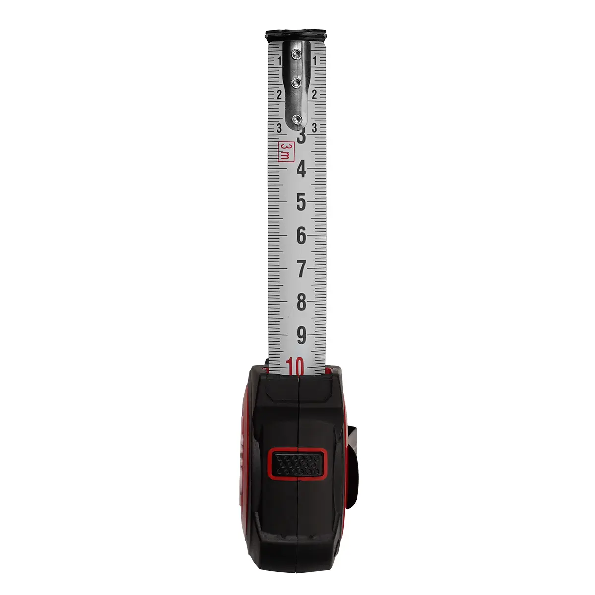 Нанесенное на полотно из высокоуглеродистой стали лакокрасочное покрытие с разметкой защищает от истирания прозрачный слой нейлона. Широкая лента измерительной рулетки за счет вогнутого сечения в рабочем положении сохраняет прямолинейность при вылете до 1,7 м в горизонтальном направлении и до 2,3 м – при выдвижении вверх. Это позволяет выполнять большинство обмеров без задействования помощника.