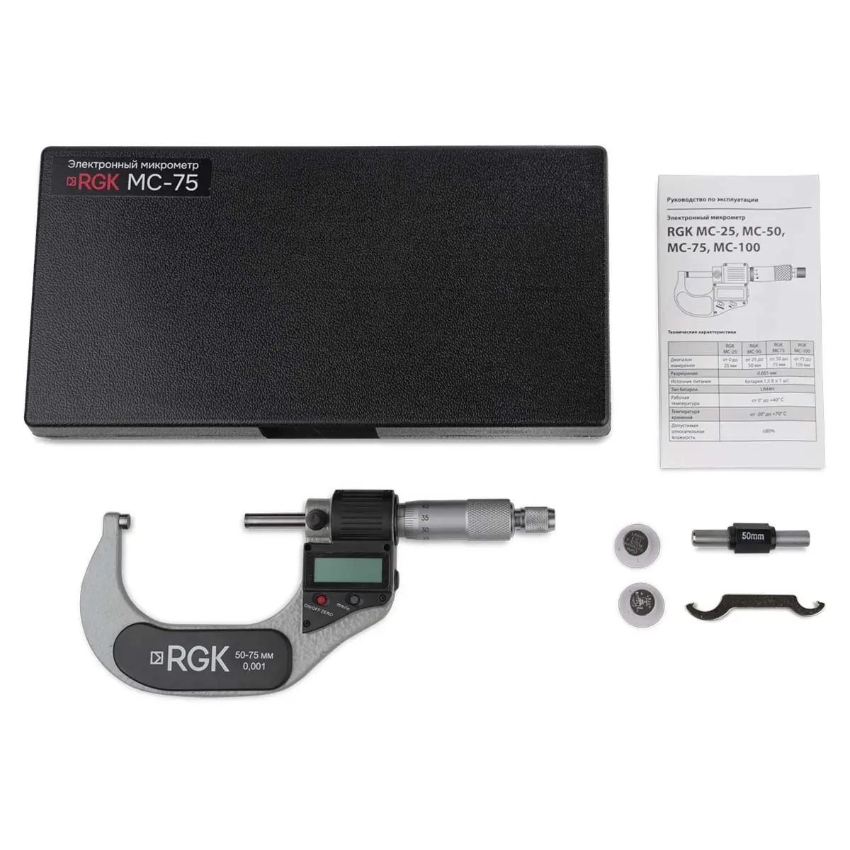 Электронный микрометр RGK MC-75, погрешность которого не превышает ±0,003 мм, служит для определения наружных размеров различных изделий в пределах от 50 до 75 мм, с разрешением 0,001 мм.