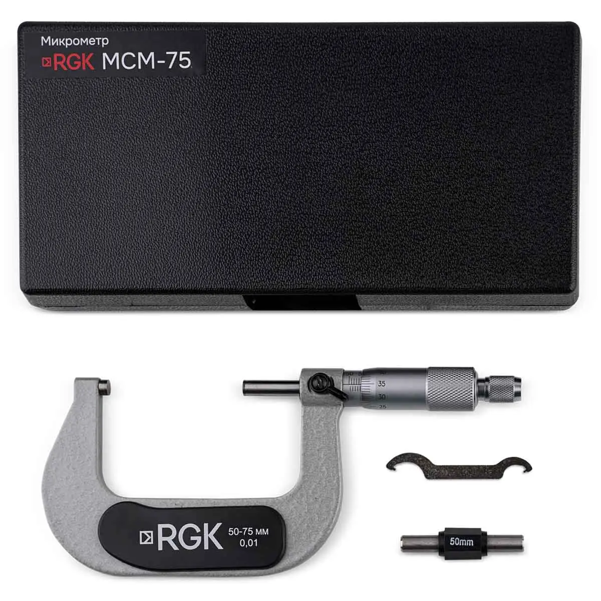 Микрометр RGK MCM-75 – механический измерительный инструмент высокоточного класса с плоскими контактными поверхностями. Цена деления отсчетного приспособления - 0,01 мм. Прибор предназначен для наружных обмеров в диапазоне от 50 до 75 мм.