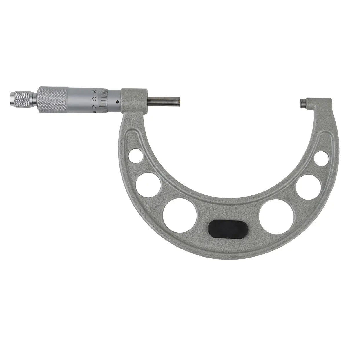 Для снижения общего веса измерительного прибора в скобе выполнены 6 отверстий. Достаточная жесткость конструкции обеспечивается за счет наличия утолщения по внешнему и внутреннему краю. С целью снижения абразивного износа измерительных поверхностей торцевые плоскости пятки и микрометрического винта снабжены твердосплавными напайками. Флажок полуповоротного зажима позволяет быстро фиксировать текущее положение винта микрометра при проведении замера, не допуская случайного измерения показаний при считывании результатов.
