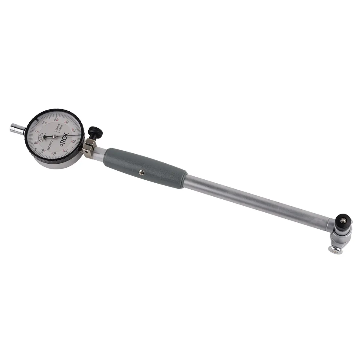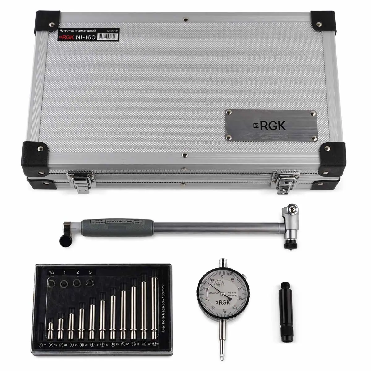 Нутромер RGK NI-160 - механический измерительный прибор индикаторного типа, который используется для определения внутреннего диаметра различных изделий в пределах от 50 до 160 мм с целью оценки точности механической обработки в ходе производства и ремонта продукции. С его помощью может производиться проверка округлости – путем выполнения серии замеров с поперечным поворотом инструмента в отверстии, и контроль цилиндричности, с отслеживанием отклонений фактического диаметра при разной глубине погружения измерительной головки в канал. Часто оборудование используется для определения степени износа рабочих полостей механизмов, например, цилиндров поршневых двигателей.