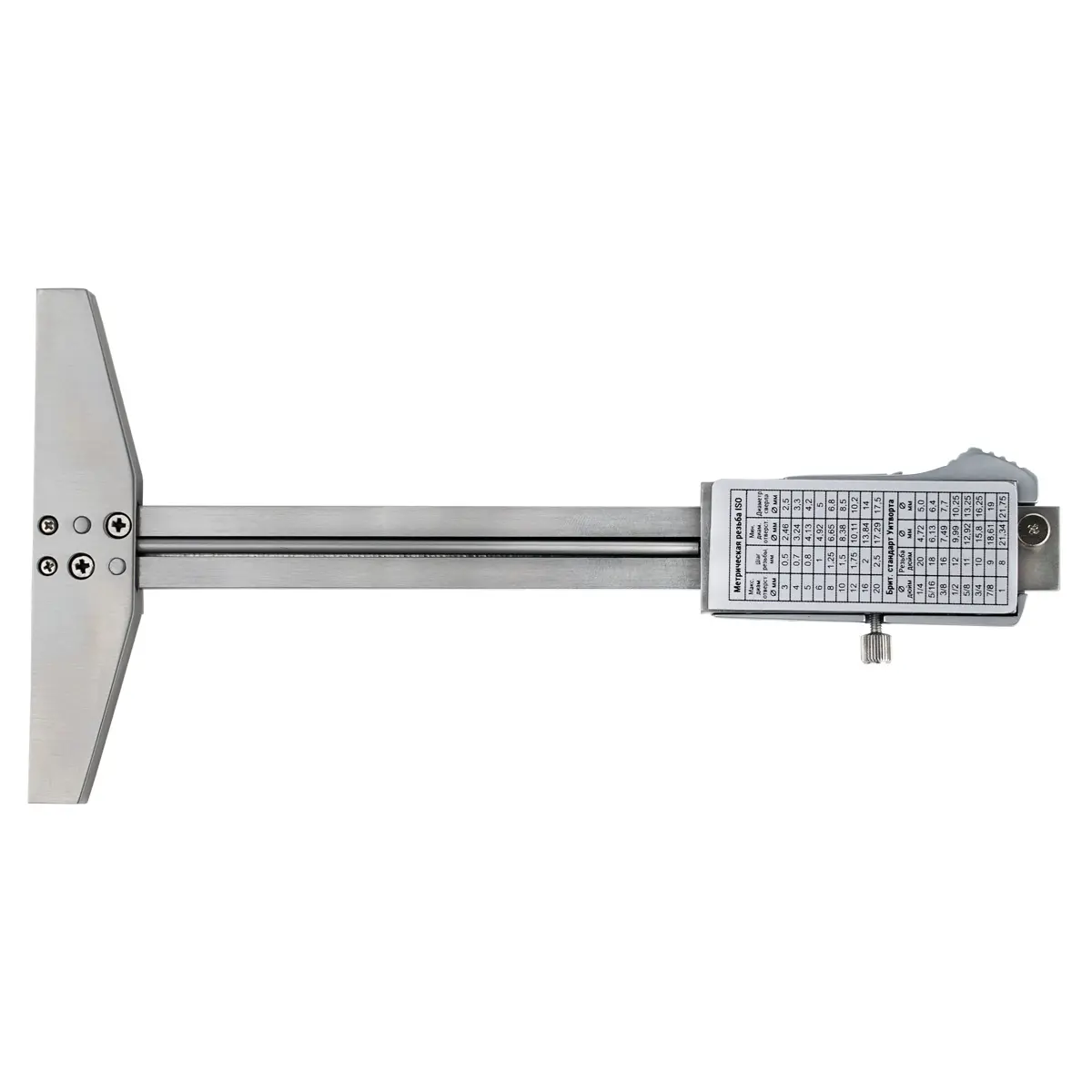 - С обратной стороны корпуса размещена справочная таблица для метрической резьбы ISO и британского стандарта Уитворта с указанием соответствия шага нарезов, минимального и максимального диаметра отверстия и рекомендованного размера сверла от 2,5 мм до 21,75 мм.