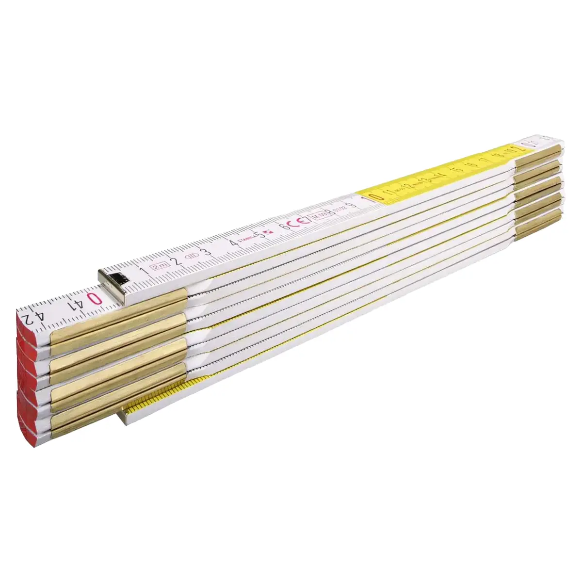 Под высокопрочными пластинами шарниров установлены стальные пружины.Заклепочные соединения имеют потайное исполнение.Составные элементы складного метра с толщиной 3 мм являются износоустойчивыми и особенно стойкими по отношению к погодным воздействиям.Головки имеют окраску красного цвета.Деление единиц измерения черного цвета с обозначением десятков красного цвета напечатано ясно и равномерно.Знак качества СЕ и метрологическое обозначение, а также сертификат испытания модели Европейского Союза.Класс точности измерения III.