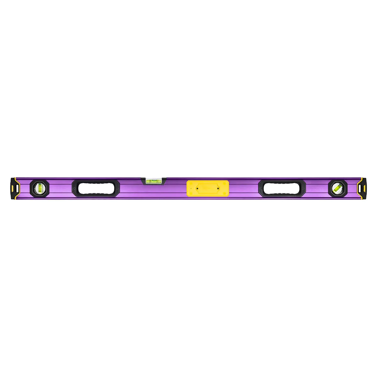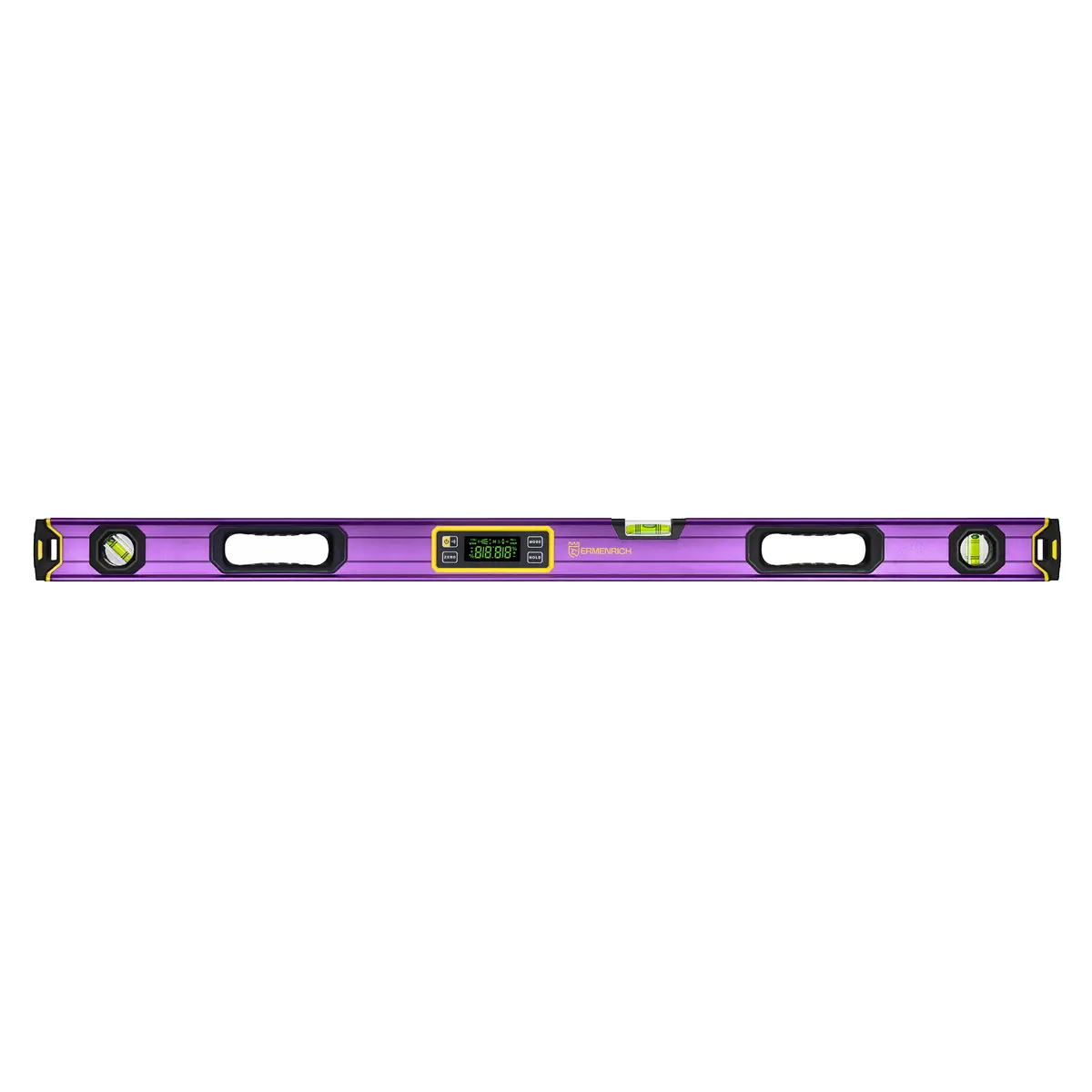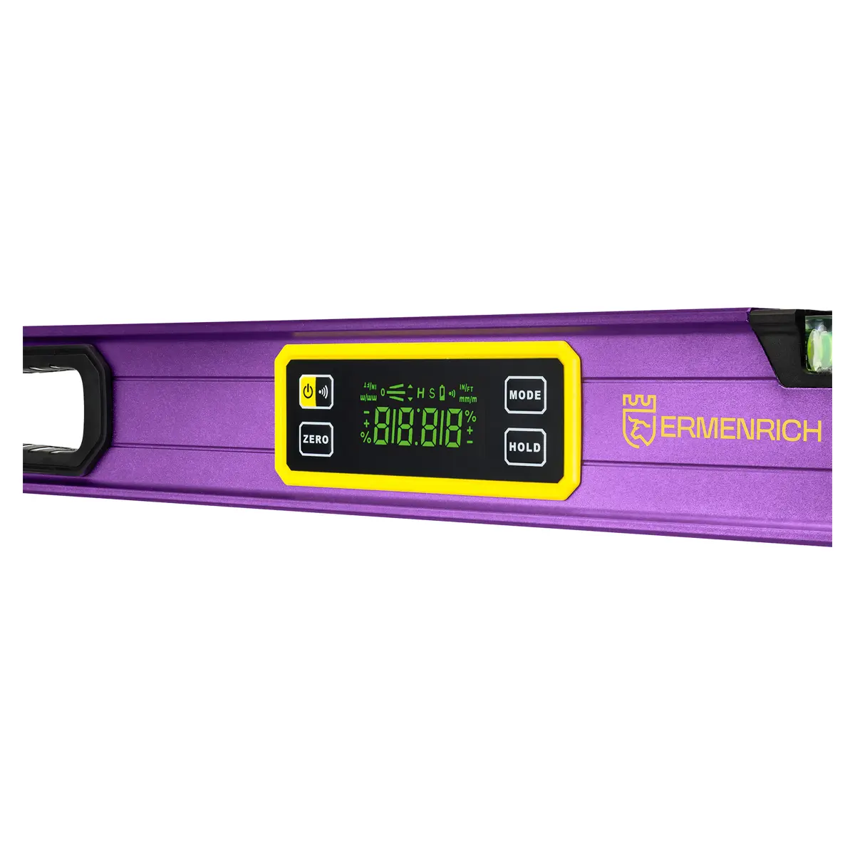 Цифровой уровень Ermenrich Verk LL100 фиолетовый выполнен в корпусе из алюминиевого сплава 1-метровой длины, с фрезерованными верхней и нижней рабочими поверхностями. Он снабжен вертикальным, горизонтальным и наклонным ватерпасами, изготовленными из устойчивого к ультрафиолету органического стекла, заполненными незамерзающим спиртовым раствором, и оборудован электронным измерительным блоком на основе встроенного инклинометра, со светодиодным дисплеем и батарейным питанием.