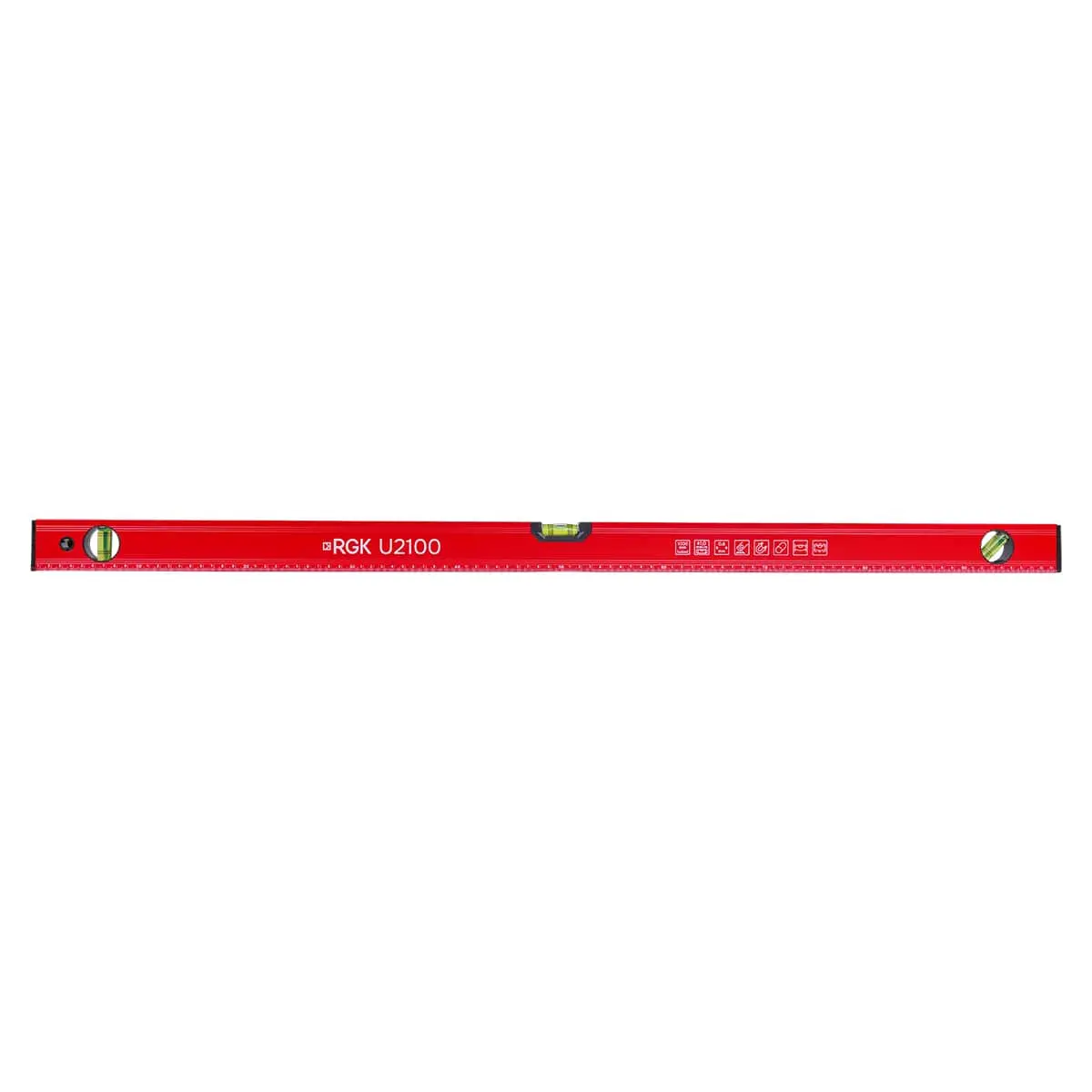 Линейка с ценой деления шкалы 1 мм поможет при разметке поверхностей. Засечки и подписи белого цвета на строительном уровне RGK U2100 выполнены методом гравировки. Они не подвержены истиранию от частого контакта с такими поверхностями, как бетон или дерево.