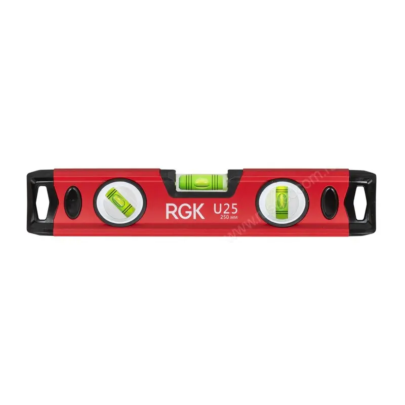 Конструкция пузырькового уровня RGK U25 предполагает наличие надежного металлического корпуса и акриловых ампул с жидкостью. Жидкость всегда стремится занять горизонтальное положение, поэтому пузырек воздуха оказывается наверху. Если он располагается между специальными метками, можно говорить о том, что поверхность абсолютно ровная.