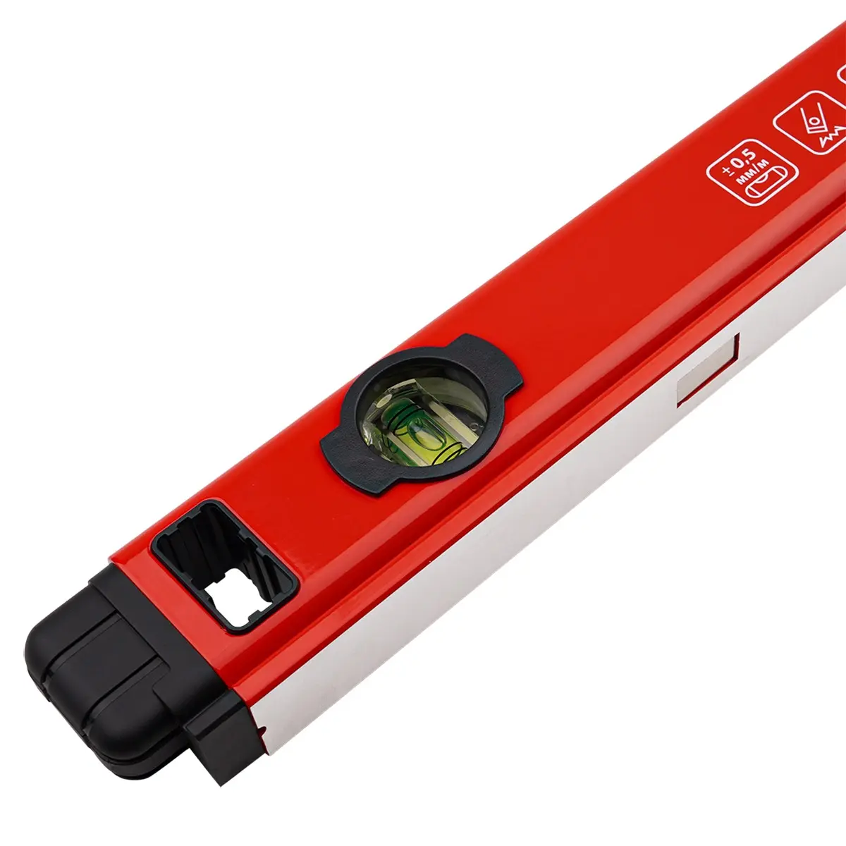 Рабочая поверхность уровня длиной 100 сантиметров позволяет контролировать значительные участки одновременно, повышая эффективность работы. Изготовленный из высокопрочного алюминиевого профиля с толщиной стенки 1,2 мм, инструмент отличается высокой прочностью и устойчивостью к деформации. Продольные выступы в нижней части профиля добавляют жесткости, обеспечивая неизменность формы на протяжении всего срока службы, даже при интенсивном использовании.