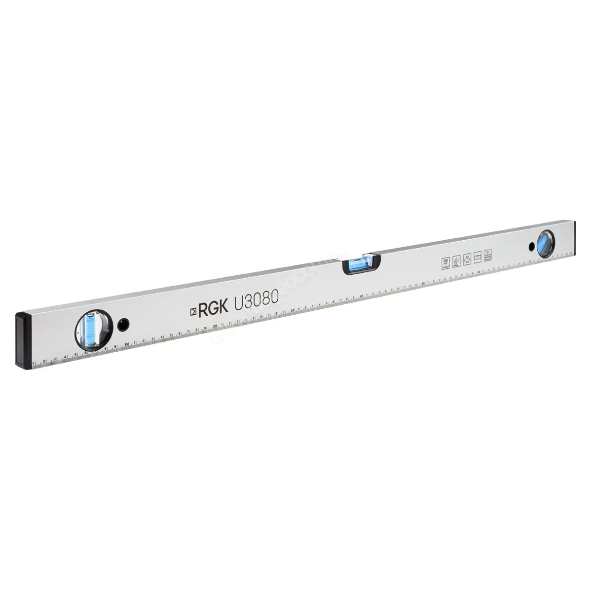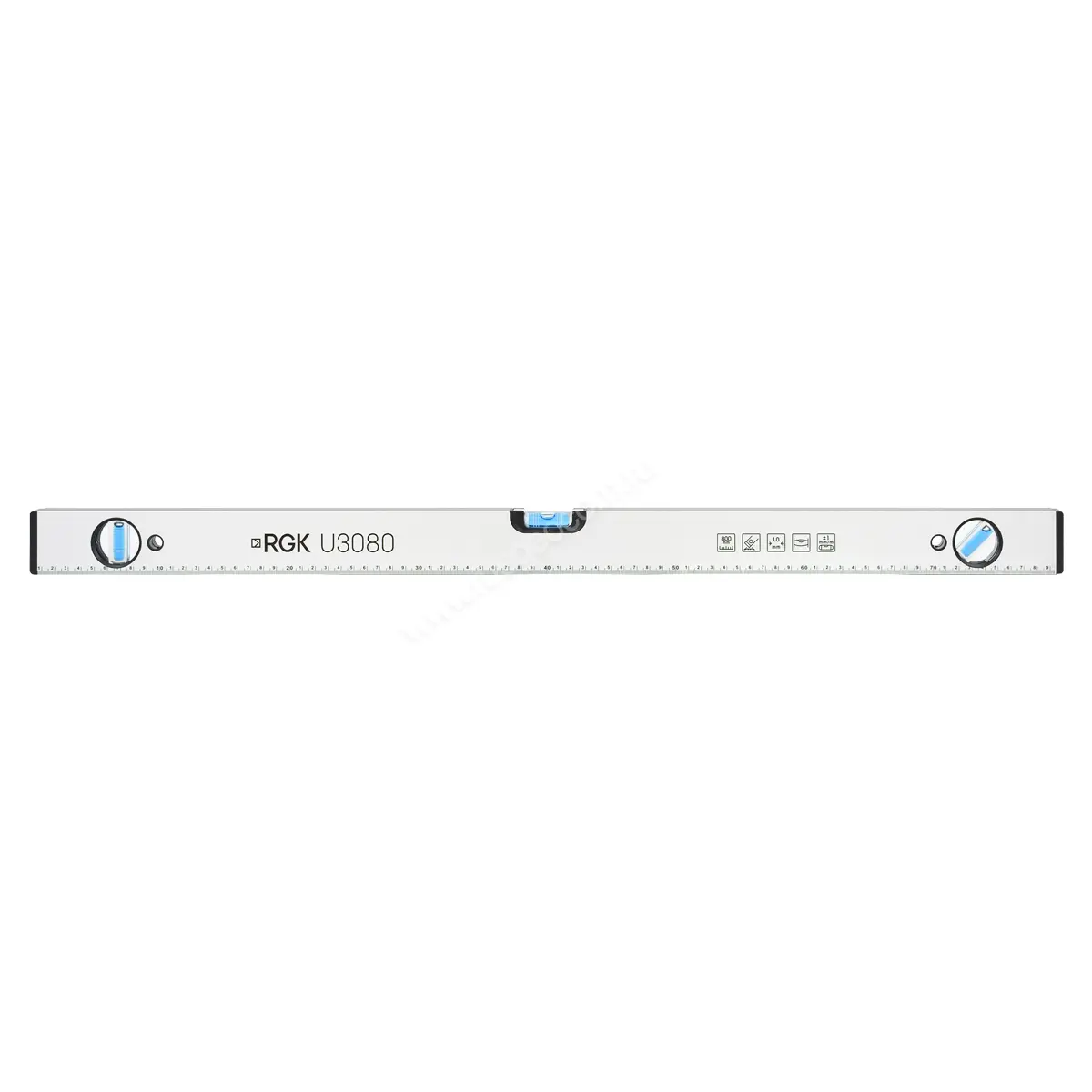 Прямоугольный корпус, рабочая длина которого составляет 80 см, изготовлен из алюминиевого профиля толщиной 1 мм, благодаря чему масса строительного уровня RGK U3080 не превышает 0,4 кг. Небольшой вес позволяет выполнять работы на весу длительное время. Противоударные торцевые вставки-заглушки предохраняют края рабочих поверхностей от случайных повреждений.