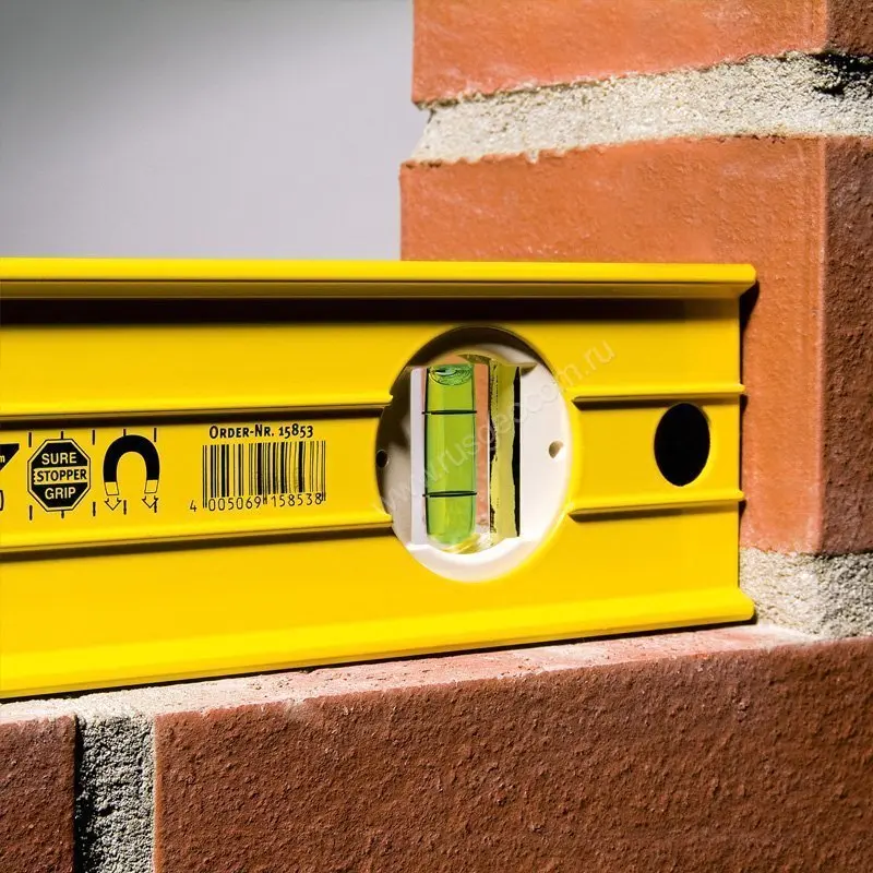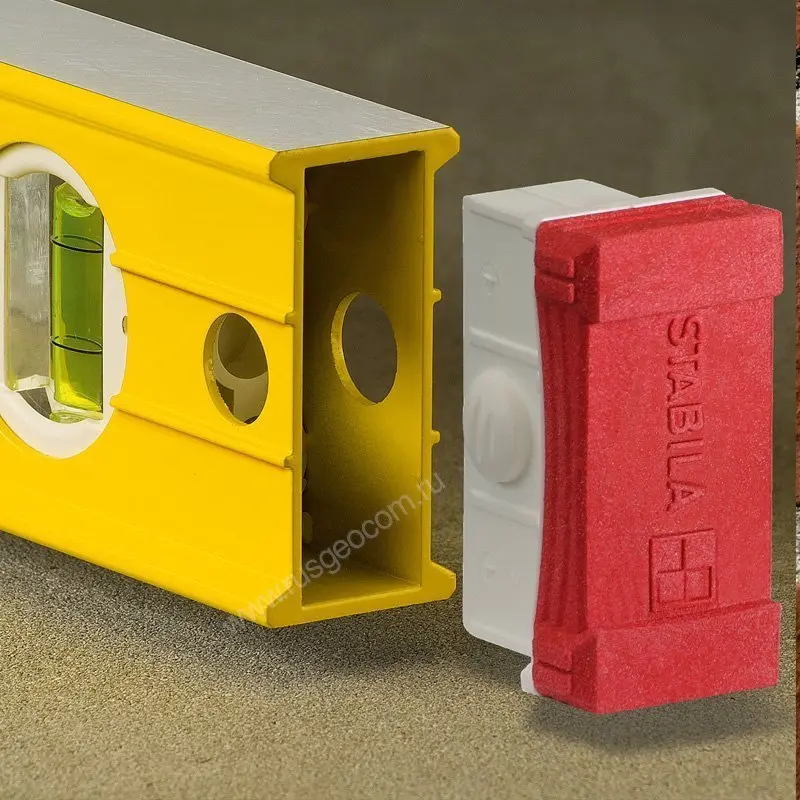• Съемные, гасящие удары, амортизирующие защитные колпачки, также имеющие с одной стороны боковые накладки (выступы) для предотвращения соскальзывания ватерпаса, при прикладывании его к скользкой или гладкой поверхности.