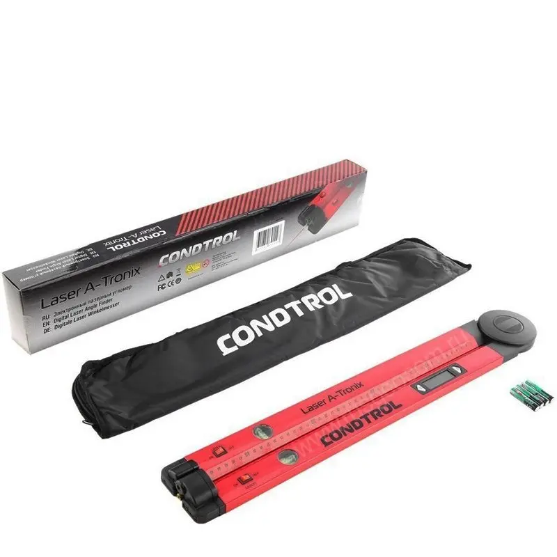 Лазерный угломер CONDTROL Laser A-Tronix оснащен лазерными излучателями, которые проецируют на поверхность стены или потолка линии, облегчающие разметку. Устройство может выполнять замеры в диапазоне от 0 до 230° с погрешностью не более 0,2°по всему диапазону.