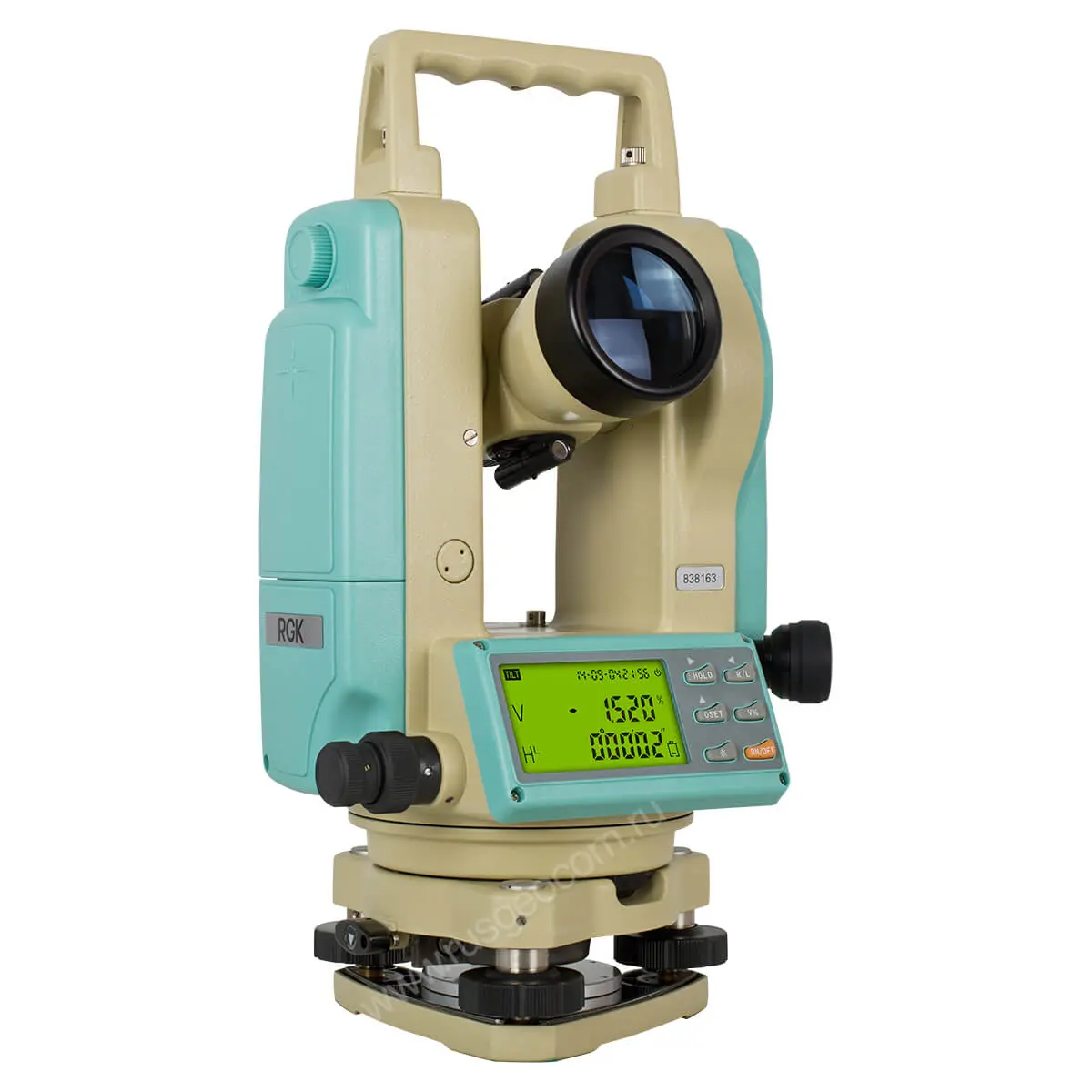 Для отображения информации теодолит RGK T-02 оснащен жидкокристаллическим двусторонним дисплеем, вмещающим 2 строки по 10 символов каждая, а ввод данных осуществляется при помощи шестикнопочной эргономичной клавиатуры, располагающейся на обеих сторонах прибора.