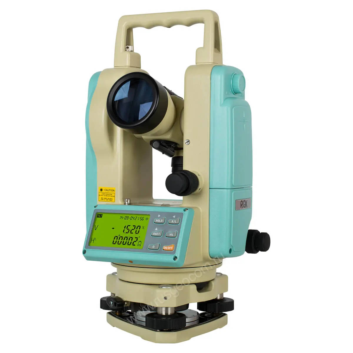 Для отображения информации теодолит RGK T-02 оснащен жидкокристаллическим двусторонним дисплеем, вмещающим 2 строки по 10 символов каждая, а ввод данных осуществляется при помощи шестикнопочной эргономичной клавиатуры, располагающейся на обеих сторонах прибора.