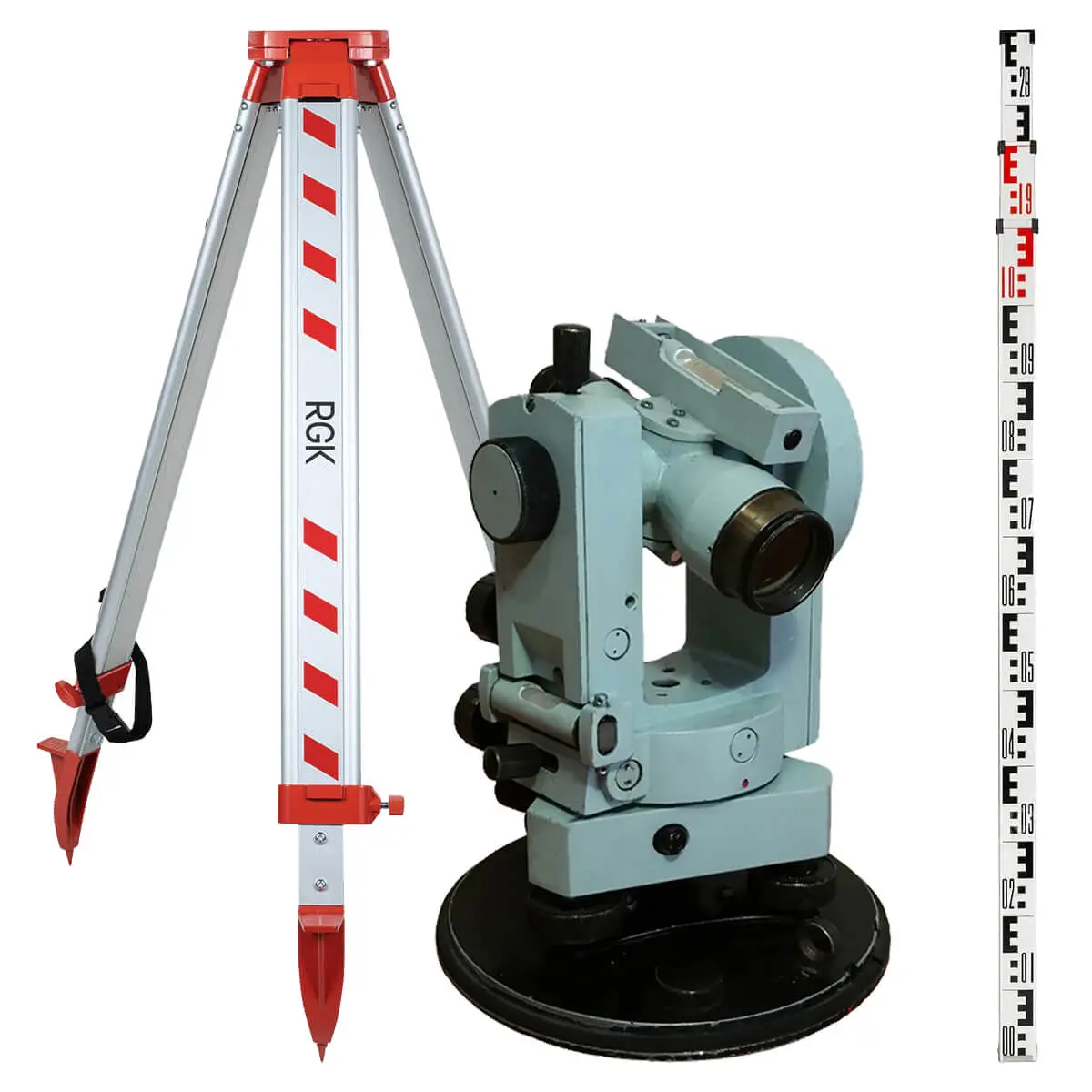 Съёмная подставка со встроенным центриром позволяет работать трехштативным способом для устранения невязок теодолитного хода. Оптический центрир с 1,8-крантым увеличением позволяет быстро и точно установить прибор на точке съемки. Специальное зеркальце круглого уровня упрощает горизонтирование прибора. Теодолит 2Т30 оснащён встроенной буссолью для ориентирования инструмента и определения магнитных азимутов.