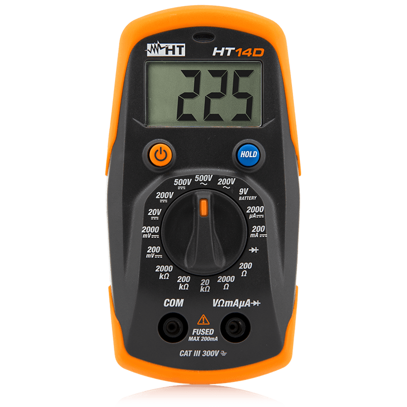 HT14D измеряет напряжение переменного/постоянного тока, сопротивление, целостность цепи, частоту, рабочий цикл, емкость и осуществляет проверку диодов. При помощи функции Data HOLD можно зафиксировать данные на дисплее.